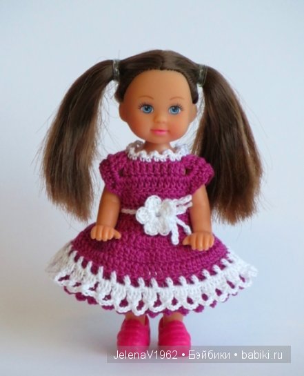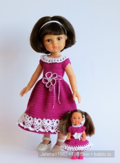 Восхищаюсь и тем, что платья у Вас удлиненные, а я такая нетерпеливая в этом отношении. Целый месяц ничего не вяжу, позавчера наконец-то закончила игрушку-хрюшку, которую начала делать для дочки еще в марте. Теперь глядя на Ваших красавиц очень захотелось снова заняться куклами!