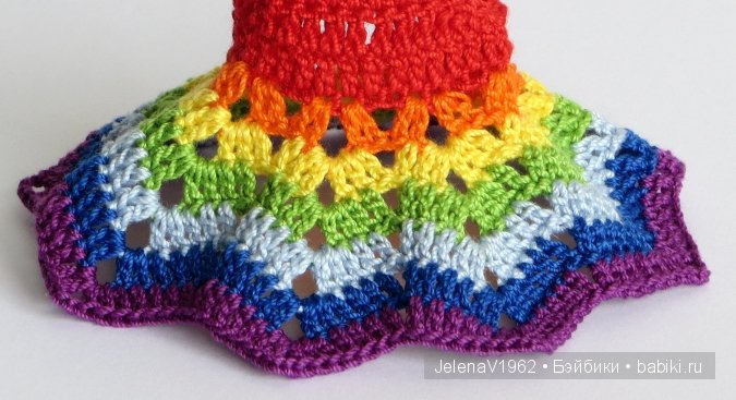 Я когда вязала радужное платье и довязывала зелёный цвет — мне уже понравилось, как выглядит, но всё-таки довязала все цвета, чтобы платья были все одинаковые по длинне.