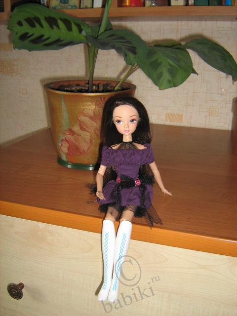 Кукла Соня вверху — не очень хорошо видно ее платье на фото — но оно очень интересное, аккуратно сшито, все в рюшечках, оборочках, очень необыкновенное. Цвет темно-феолетовый, немного мрачноват, но сама модель впечатляет.Волосы у нее очень просто уложены — просто распущены — на вид хорошо прошиты, не густо, но аккуратно — на одном расстоянии.(интересно они как у дешевых Барби только по кругу, а внутри лысина или все-таки лучше?) В общем, эта Сонечка мне понравилась больше всех, своей простотой и она на шарнирах!