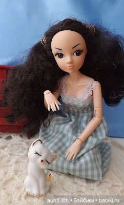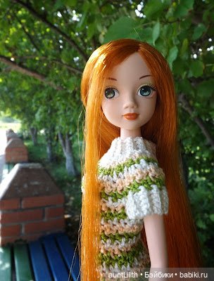 Я тоже в интернете видела фото, где у подобной куколки волосы прошиты под причёску, и при распускании даже прядки разной длины. Но у моей Саши прошивка по всей головушке, густота средняя, прядки одинаковой длины. Я её брала на вторичке, поэтому не знаю, первоначально так было, или предыдушие её хранительницы дорабатывали причёску. Возможно, куколки разных выпусков имеют разные прически?..