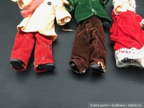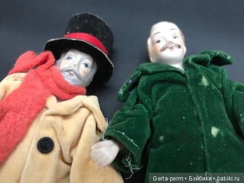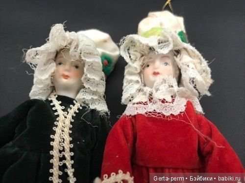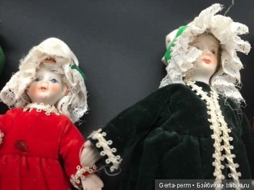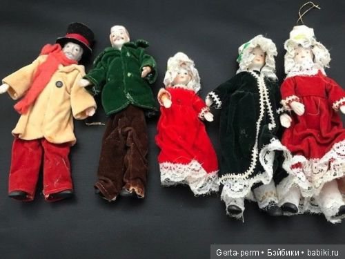 Всё имеют фарфоровые головы и руки, тела тканевые, лица расписаны в ручную. Ранее использовались как ёлочные украшения. Предположения развеяться…