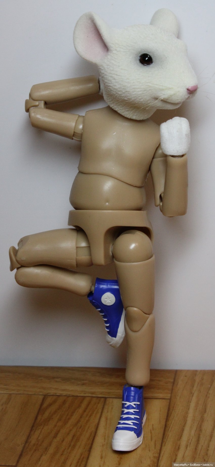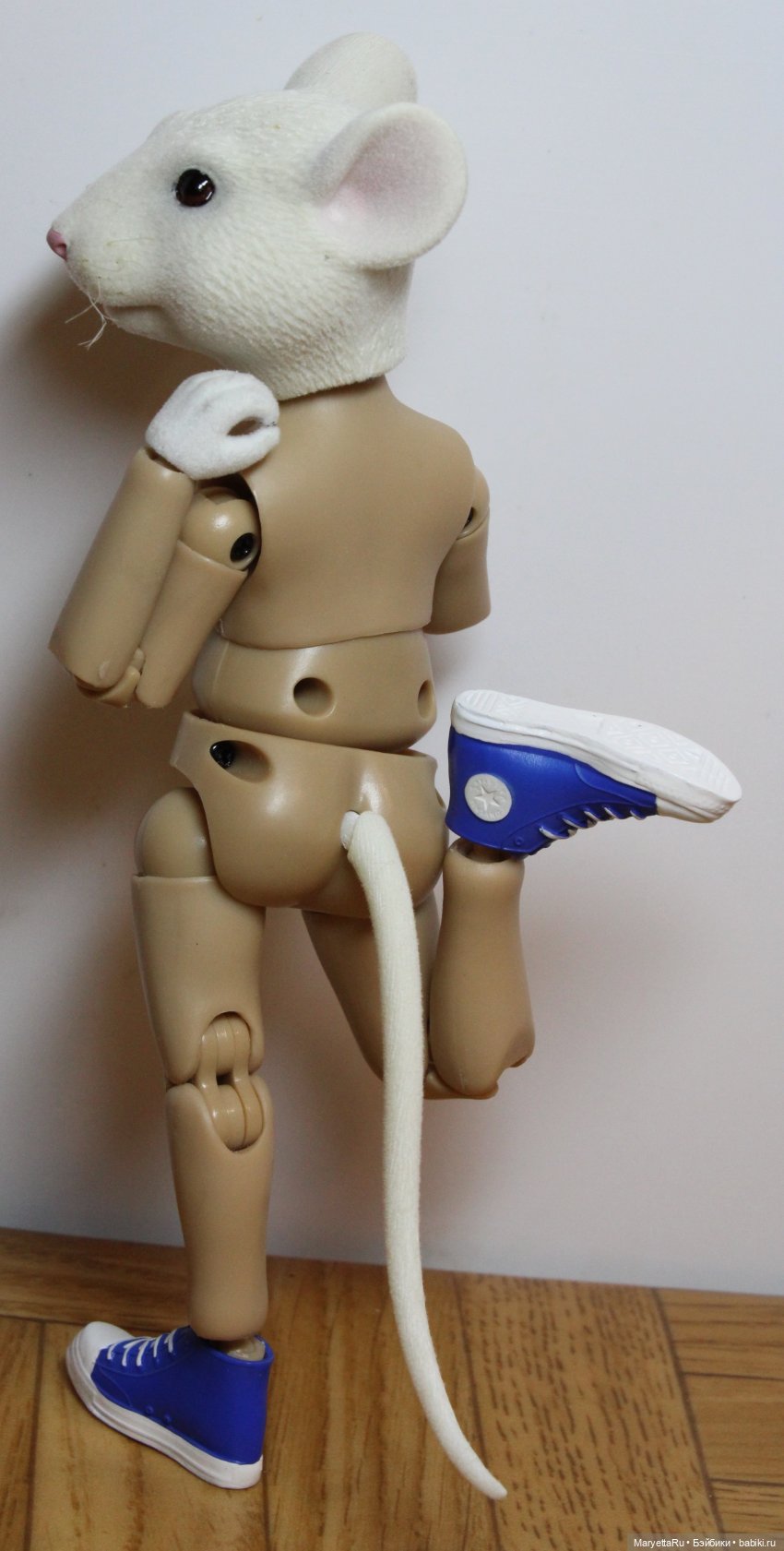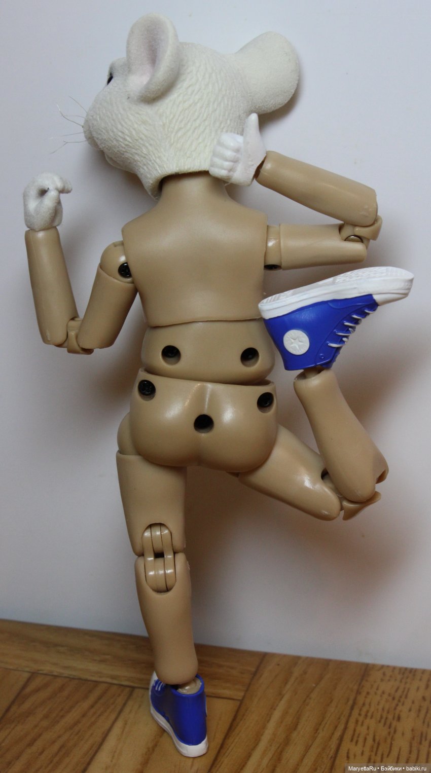 В локтях и коленях двойные шарниры, что позволяет мыши чесать блох по всей спине или пнуть саму себя. Тело состоит из трёх частей, что позволяет слегка нагибаться вправо-влево и отлично поворачиваться направо и налево. В крепёжную дырочку вставляется хвост.