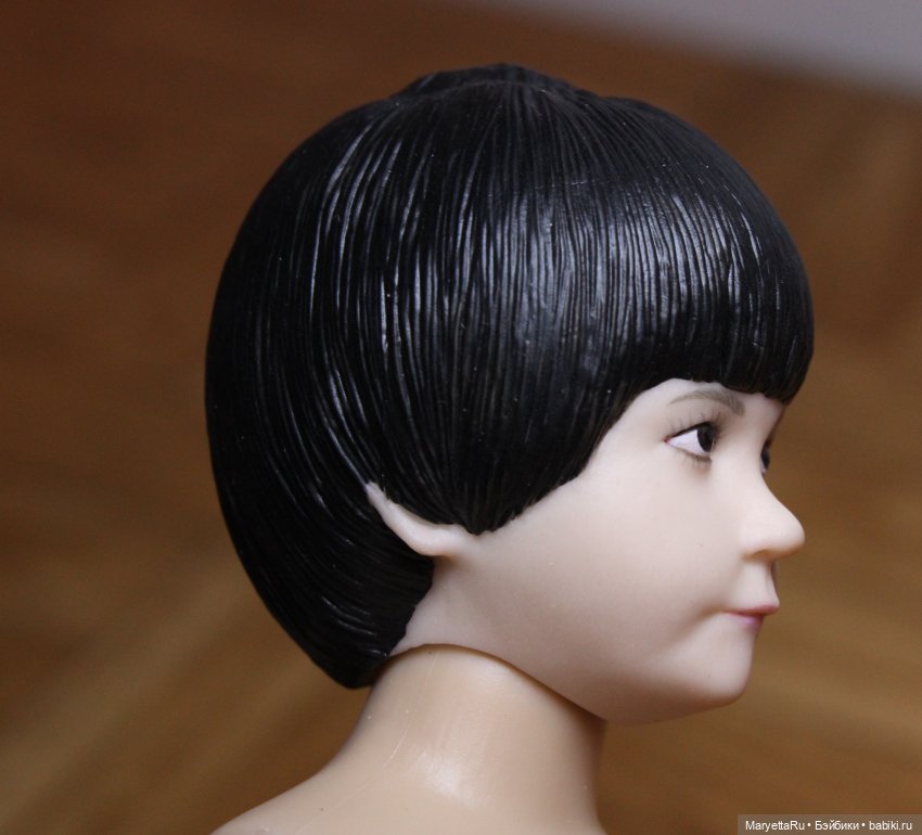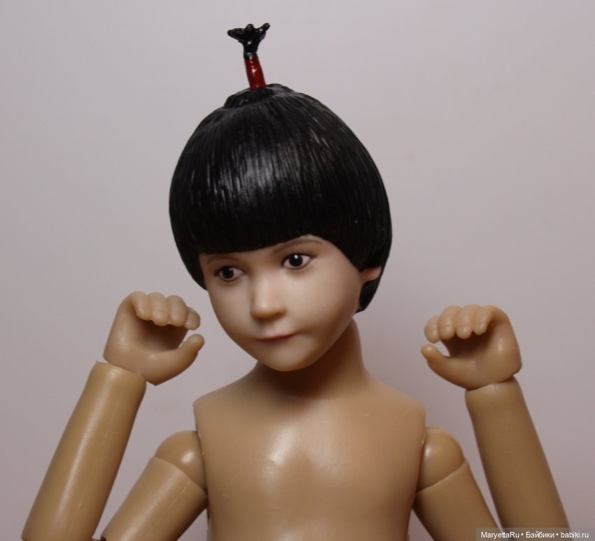 Волосы на голове молдированные, хвостик легко вынимается и вставляется в дырочку на макушке.