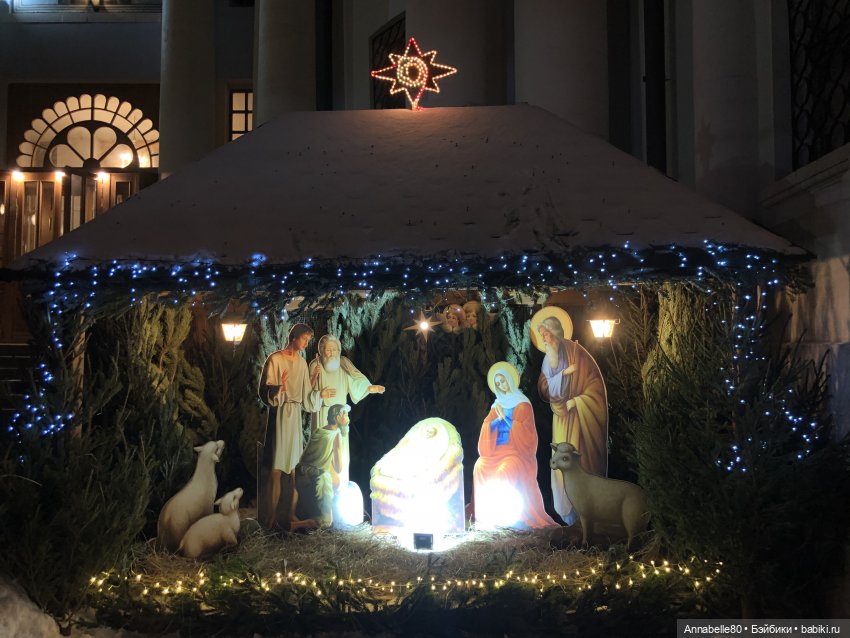 А завтра утром мы все пойдём на рождественскую службу, а потом — на рождественский обед к моим родителям. Этой традиции уже много лет. Рождественский вертеп перед нашим храмом: