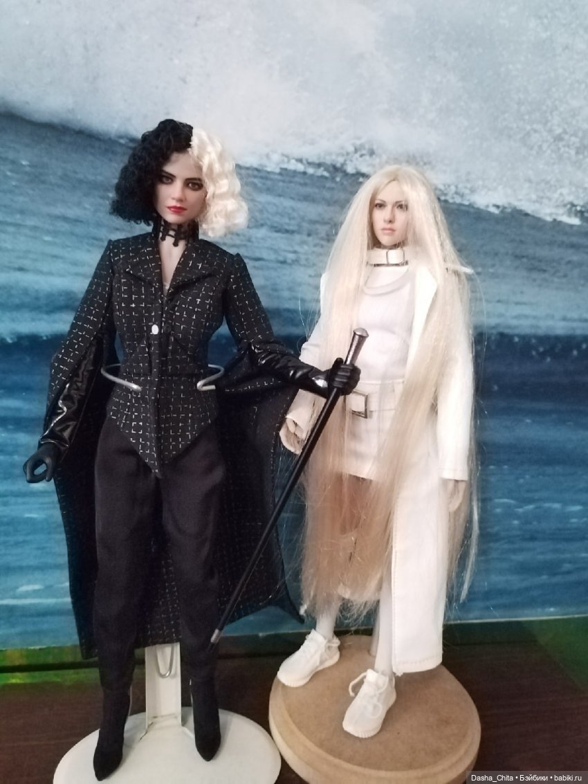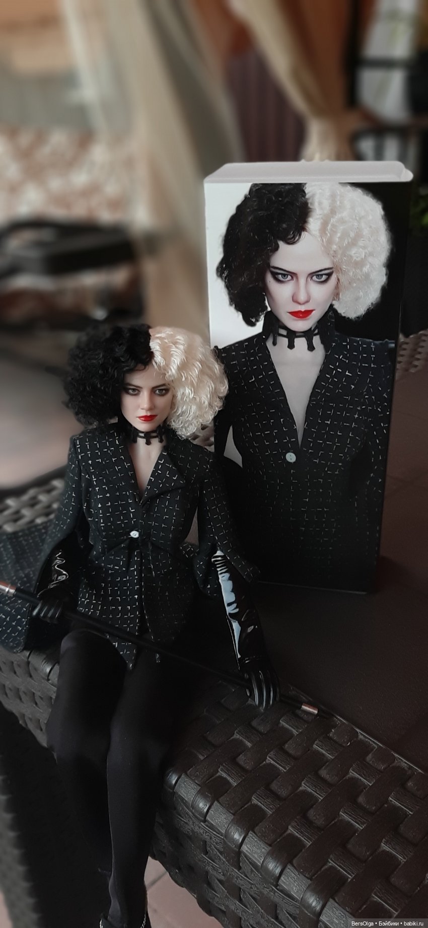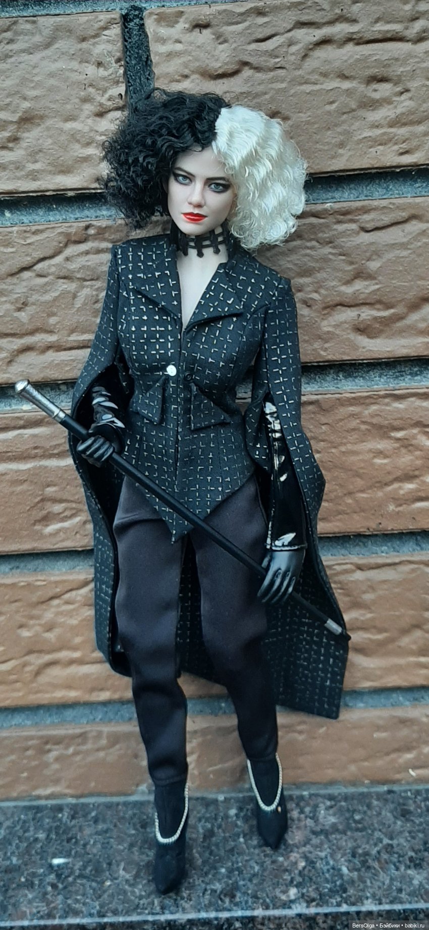 <cut name=«Выбор аутфита, как по мне, не самый удачный, лучше бы выпустили с черно-белым пятнистым „долматинчатым“ пальто. Я на свой страх и риск (т.к. видела только промо, реальных фото не было на тот момент) заказала этот сет, фильм меня зацепил своими нарядами и очень захотелось Круэллку в подружки к моим Харлушкам Квинн (кстати, Круэлла 2021 года явно косит под Харли Квинн-начиная от одинакового повествования-от первого лица и сцены начала фильмов абсолютно идентичны, да даже сцена с 5-ю стадиями принятия и то перетащили в Круэллу, а её мундштук заменили тростью (причем трость Круэлла держит ровно так же как Харли Квинн свою биту /молот).