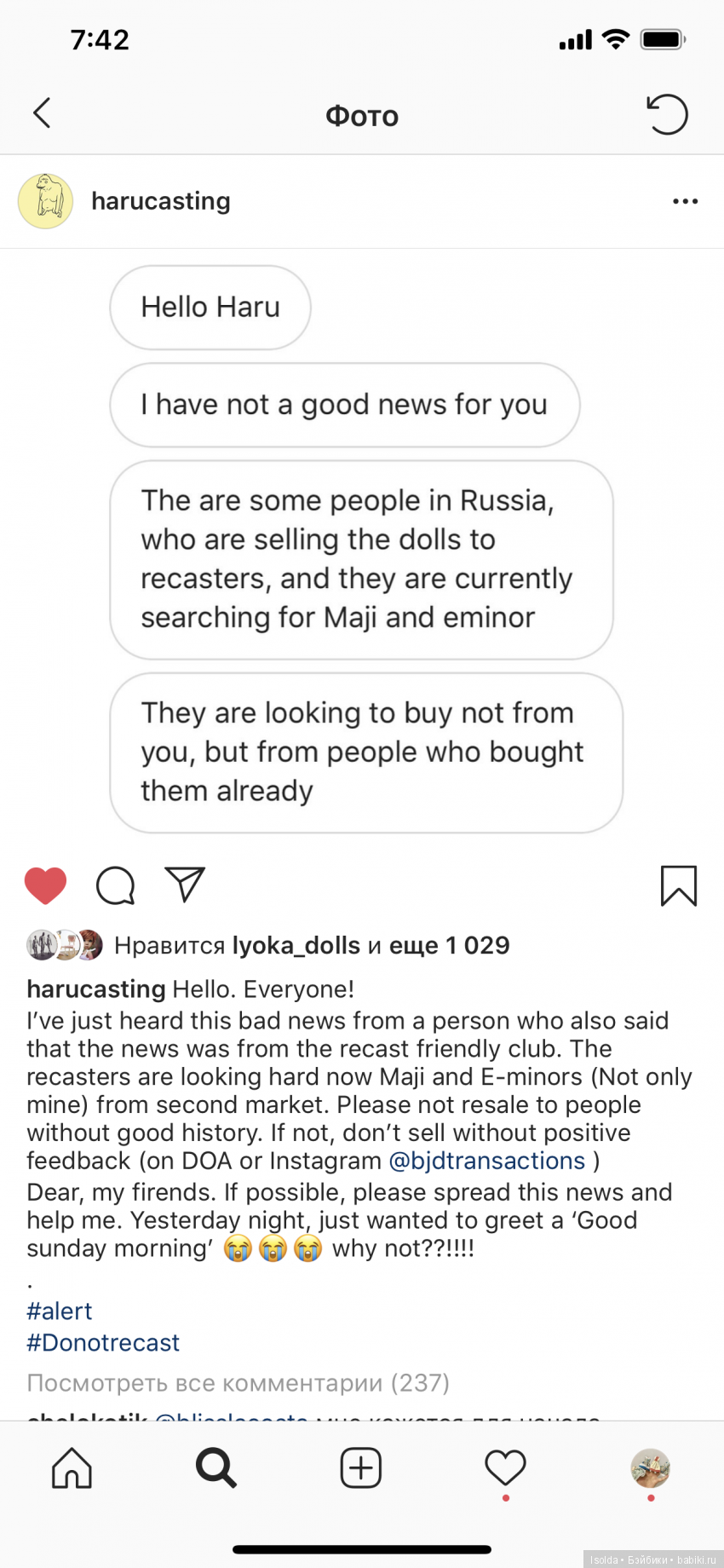 После этого стала относиться к покупкам ещё тщательнее. Хотела купить куклу, но цена меня в ней смущала и показалась низкой. Зарезервировала куклу до оплаты и решила проверить информацию ещё раз. Этих кукол тоже подделывают часто. В объявлении продавец не указал, что тело от куклы другой фирмы (оригинальное ли — тоже вопрос). В оригинальности головы я тоже не была уверена. Продавец на мои вопросы ответила снятием резерва, повышением цены и продажей куклы другому без указания того, что выяснилось, и написала, что я превратила покупку в расследование оригинальности.