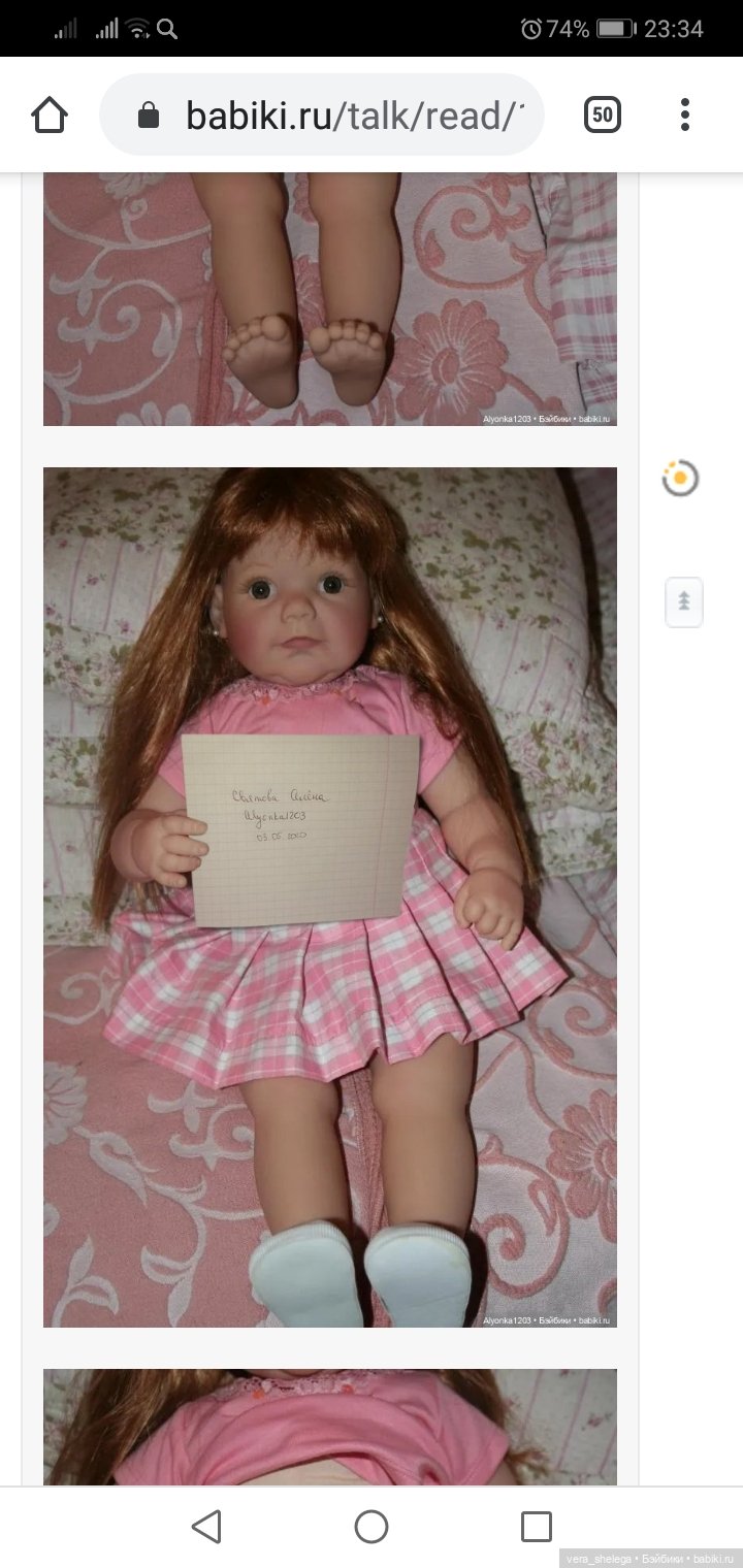 Вот, допустим, я иногда ломаюсь… Брать или не брать. Я пишу продавцу и прошу доп фото. Я могу подумать пару часов и ещё что-то уточнить. В этот же день я отвечу, буду ли я совершать покупку или нет… Ну пусть кто-то так помучается пару дней. Но не месяц же. Рекомендую все фото делать с бумажкой «куклу продаёт такая-то на сайте бейбики». И расположить её так, чтобы ни отрезать, ни замазать. Или, вообще, отказать в дополнительных фото, сказать, что вы ей уже все досконально показали. Очень подозрительная девушка.