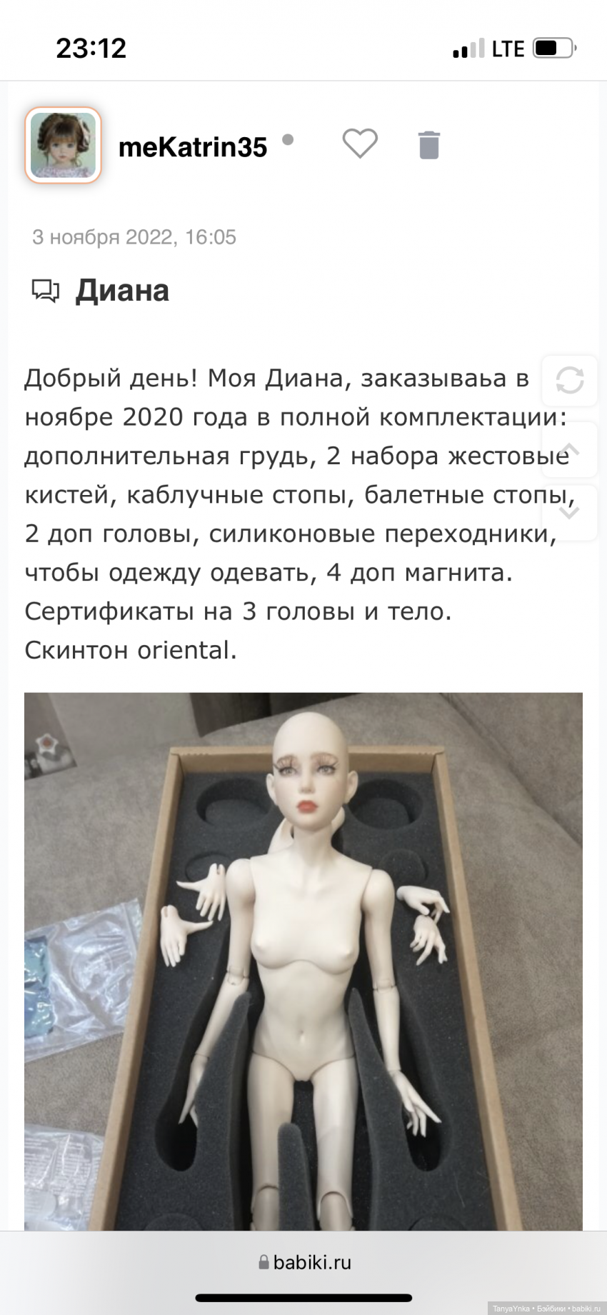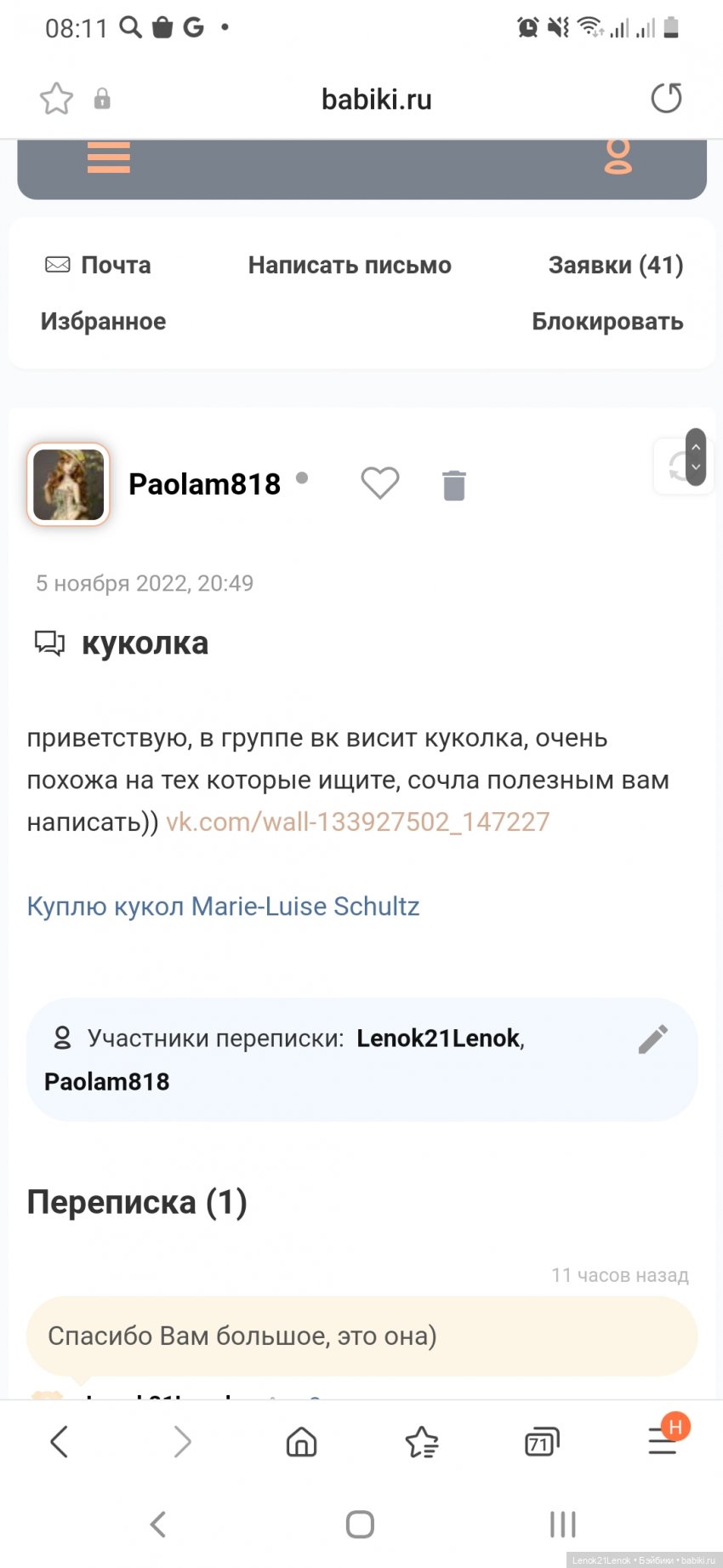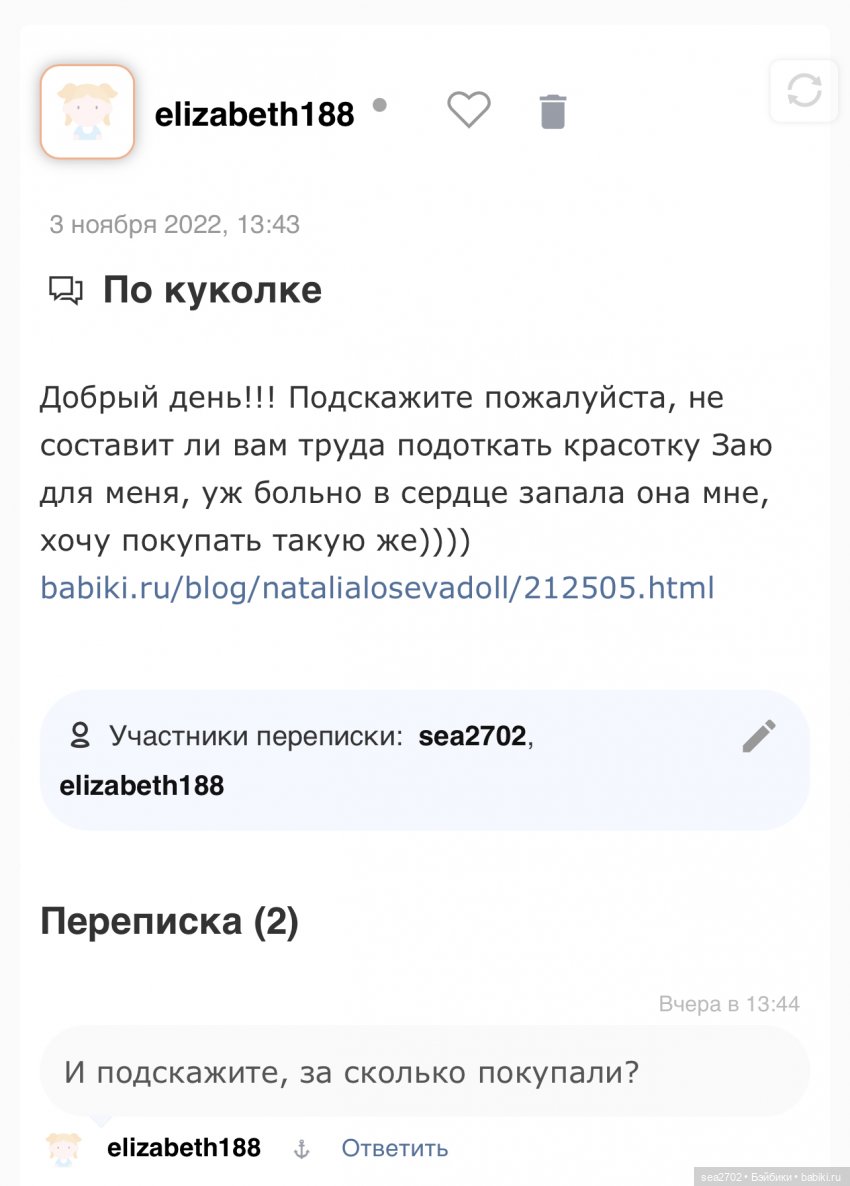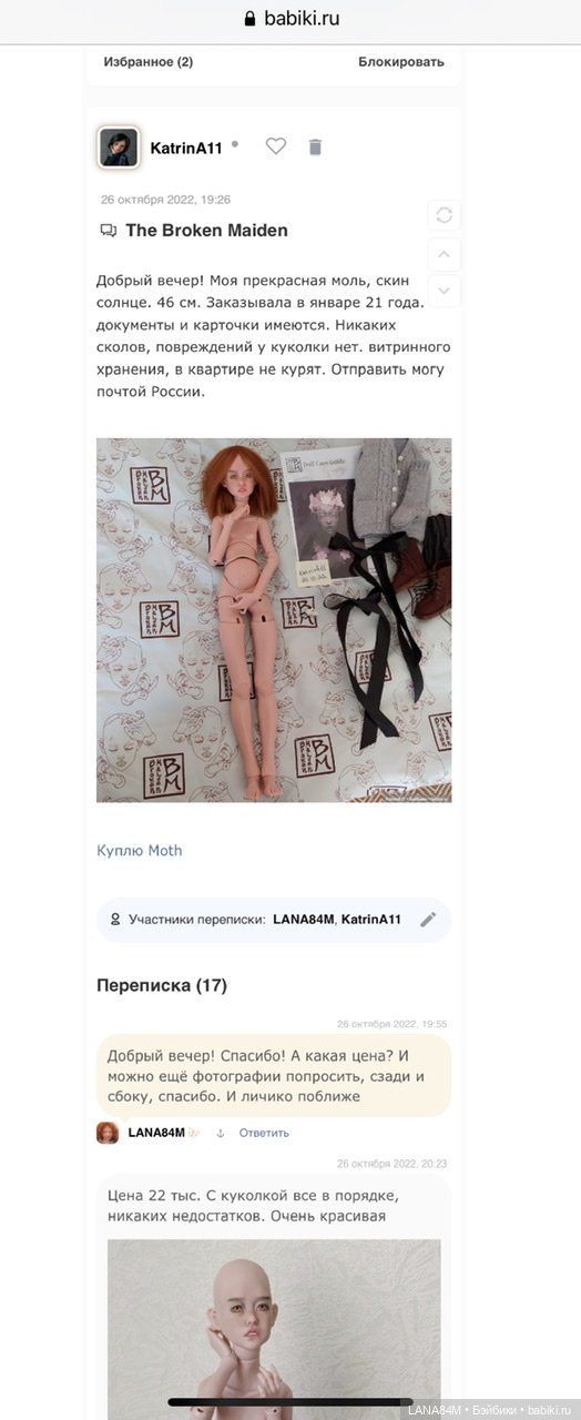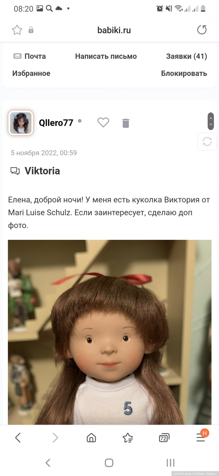 Куколка была предложена на мое об’явление о покупке. Я видела, что новичок, так приятно пообщались, мне прислали фото с ником, внесла аванс и все…