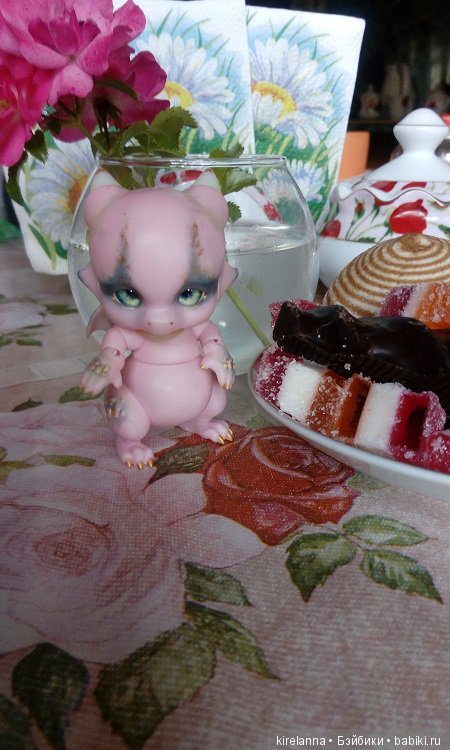 пьянкапляска, даже платьице с корабликами надела, ну и нос у нее поцарапан как у настоящего пирата.Гиацинт бесподобен, для такого дракоши никаких конфет не жалко:))