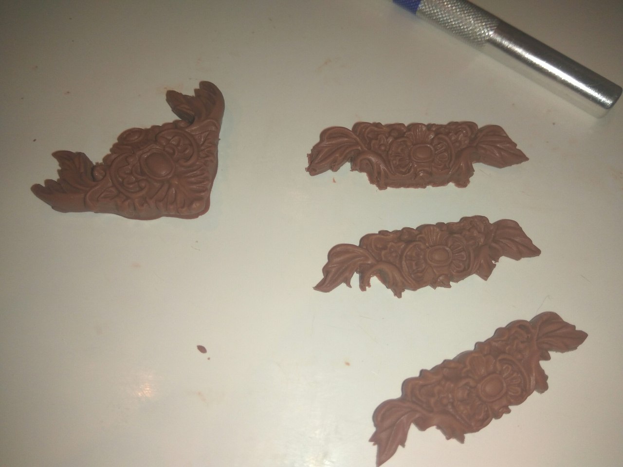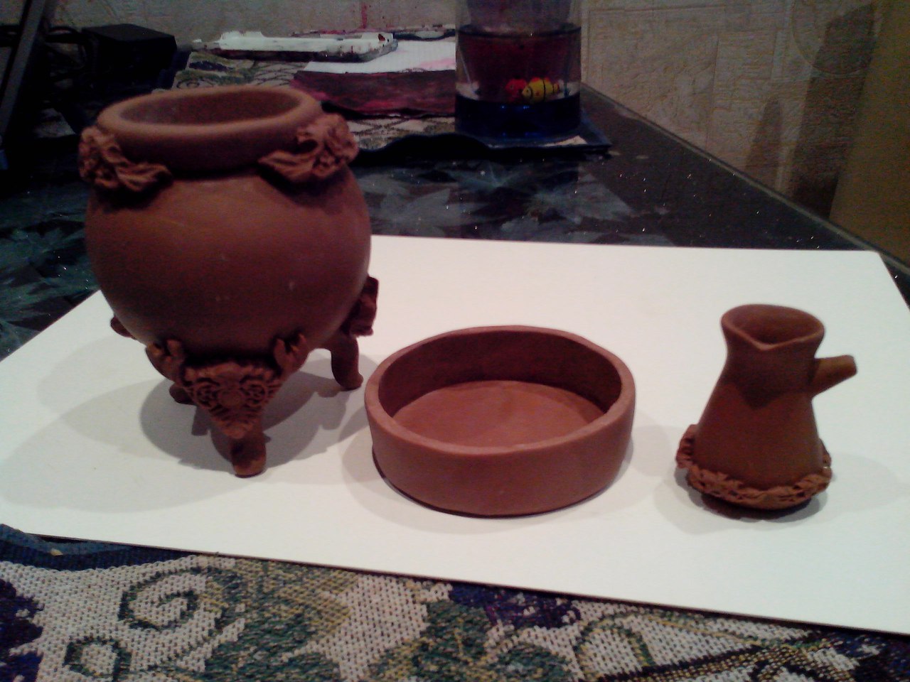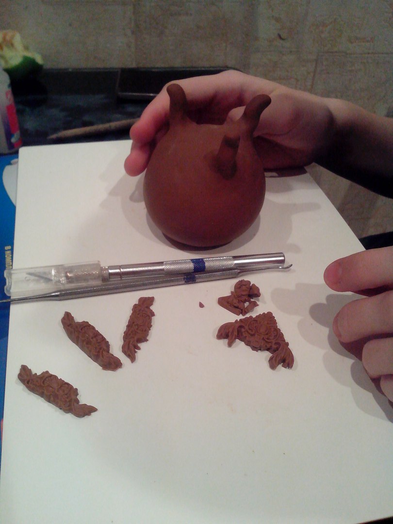 Сегодня с утра вышкурила печку и турку. Из турки выколупала основу из фольги. Потом старшая дочь приклеила декор и на печку и на турку, а я лепила еще поднос с высоким бортом для песка.