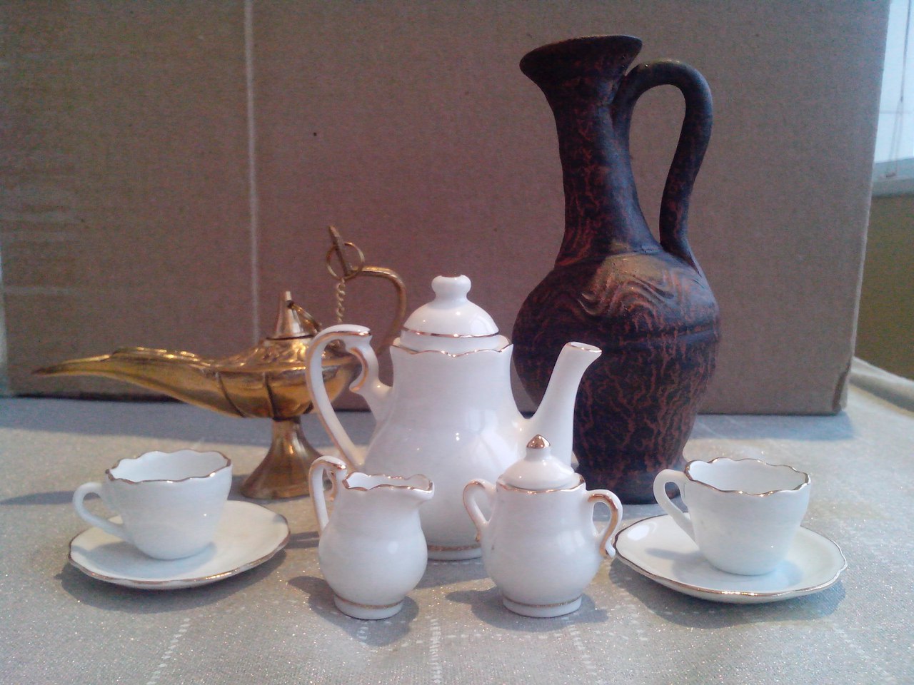 Например, нашла чудесный фарфоровый сервиз, настоящую латунную маслянную лампу и глинянный кувшин. А вот круглую печку и турку для варки кофе найти не могу.
