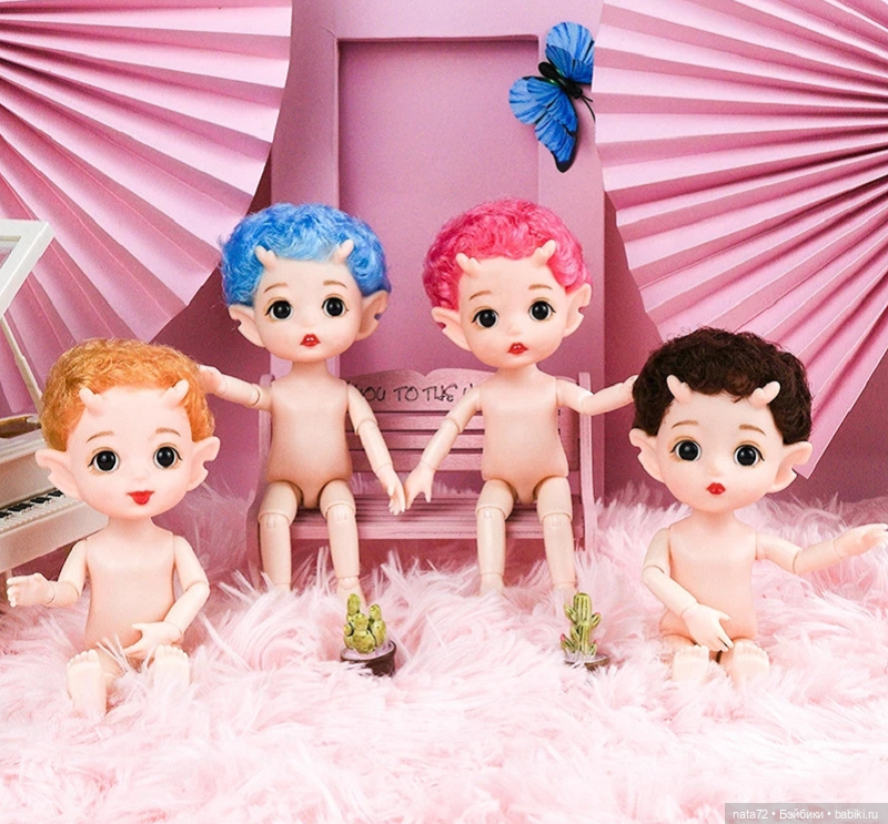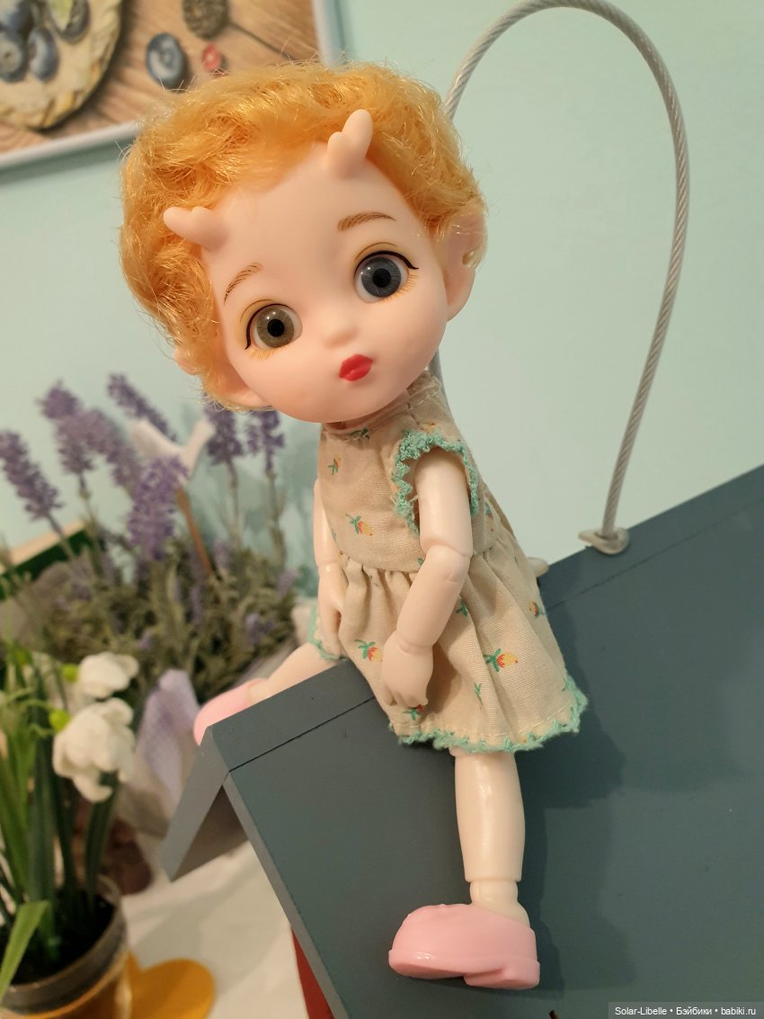 Такой вот бесёнок, маленький, но очень забавный и прикольный. Куколка очень качественная для своей цены, полностью шарнирная! Глазки вставные, были в комплекте чёрные вообще без зрачков, я поменяла на другие, по идее нужны чуть побольше, но не нашла таких, поэтому получились глубоко посаженные, маловаты немного для этих глазниц. Зато цвет такой, как я хотела.
