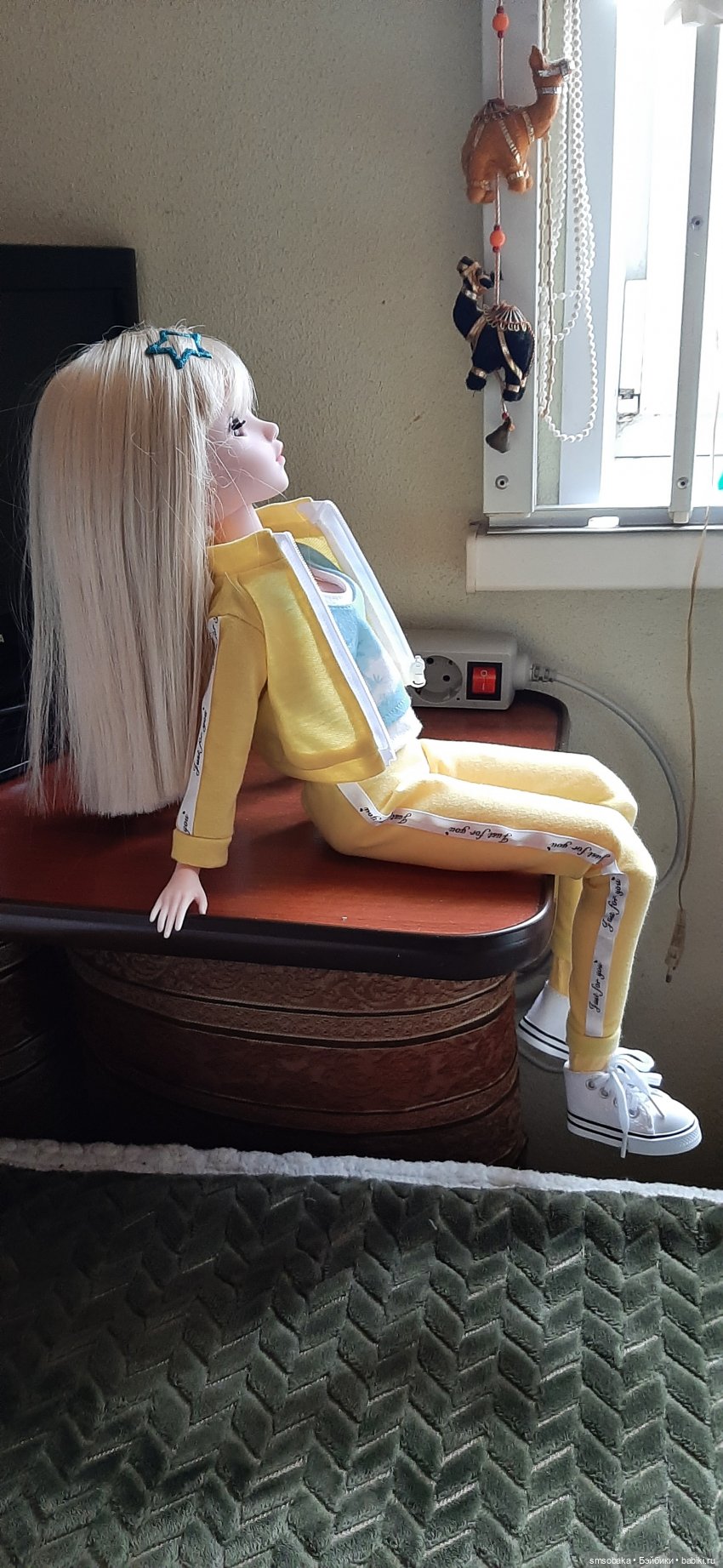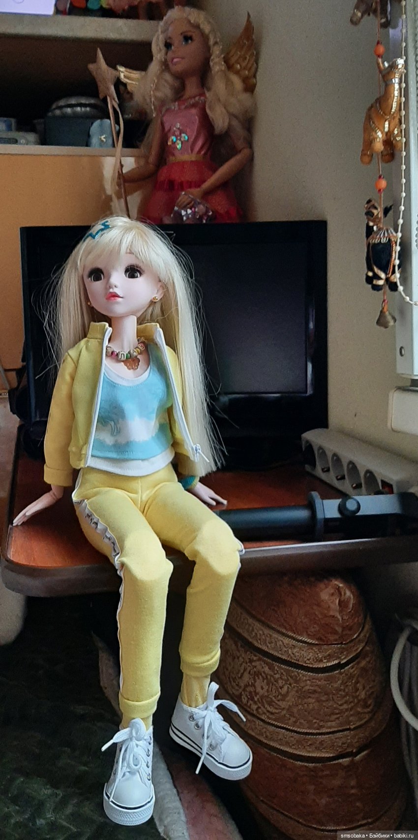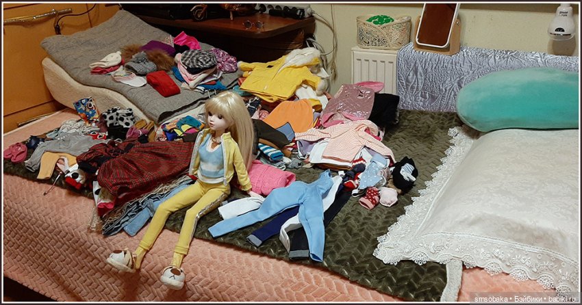 Нет, все одёжки и аксессуары у меня от разных кукол. Применяю по надобности. Мирочке досталась большая коллекция одежды от Кидзиков. Правда она длинноногая. Продавалась она в жёлтом костюме и кедах. Теперь она у меня «богатая невеста»!