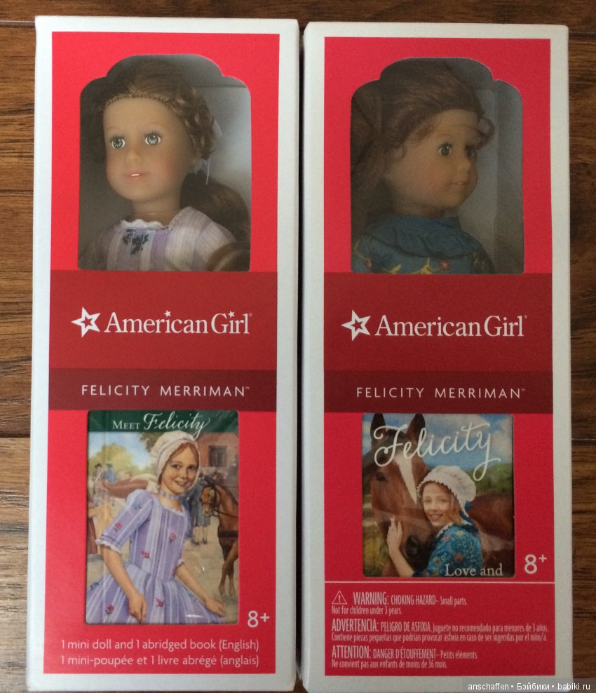 Обложка книг у виниловых версий куколок отличается. Классическая книга, обложку которой при перевыпуске с набивного тела на виниловое не стали менять, находится слева. И книга называется «Знакомство с Фелисити»