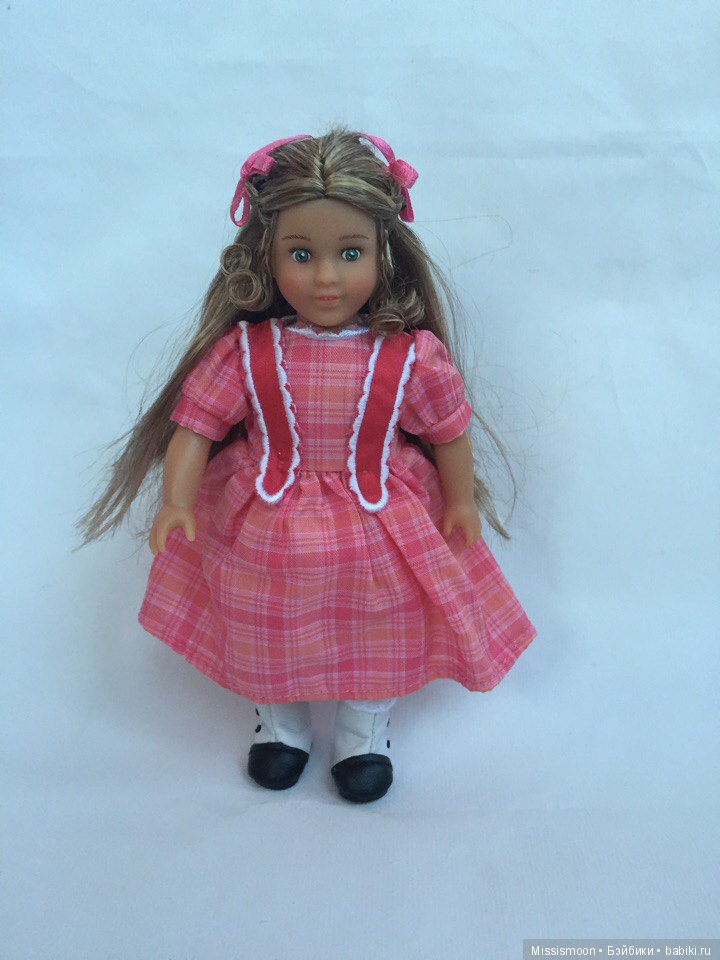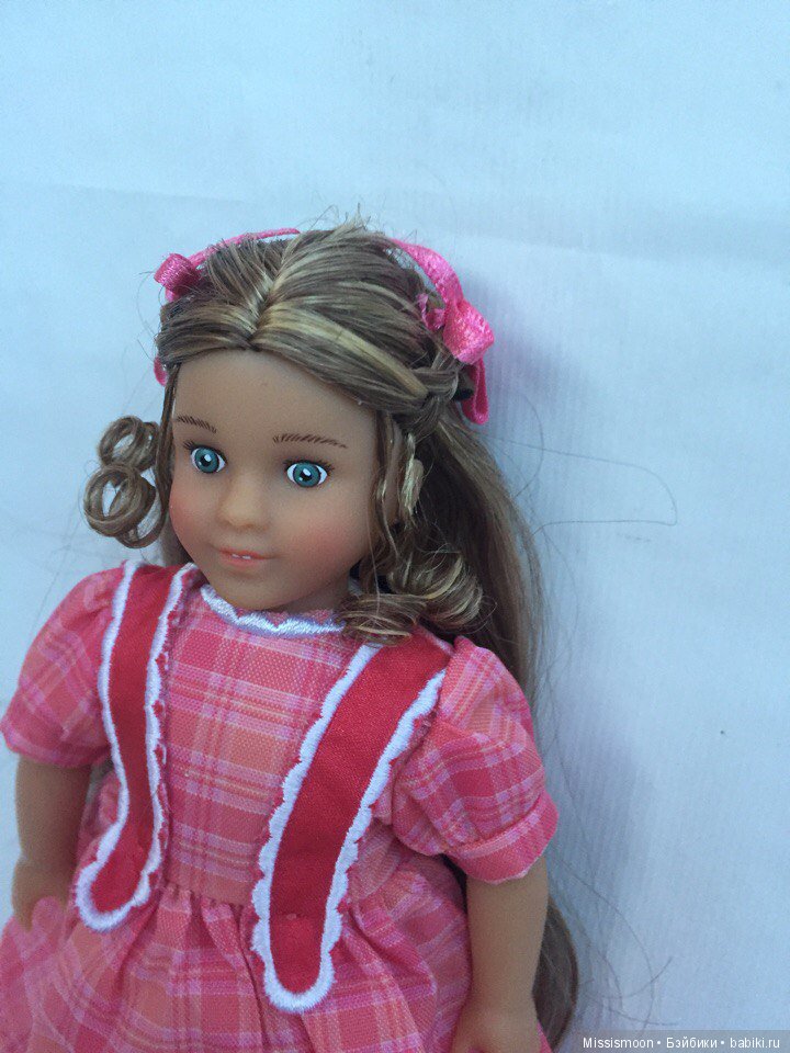 А вообще мини версия этой девочки выпускалась 5 раз(!) и первый из них в 1997 году вместе с выпуском большой куклы, когда American Girl еще принадлежала Плезент Компани (Plesent company). Тогда мини-версия девочки была с париком и вставными стеклянными глазками.
