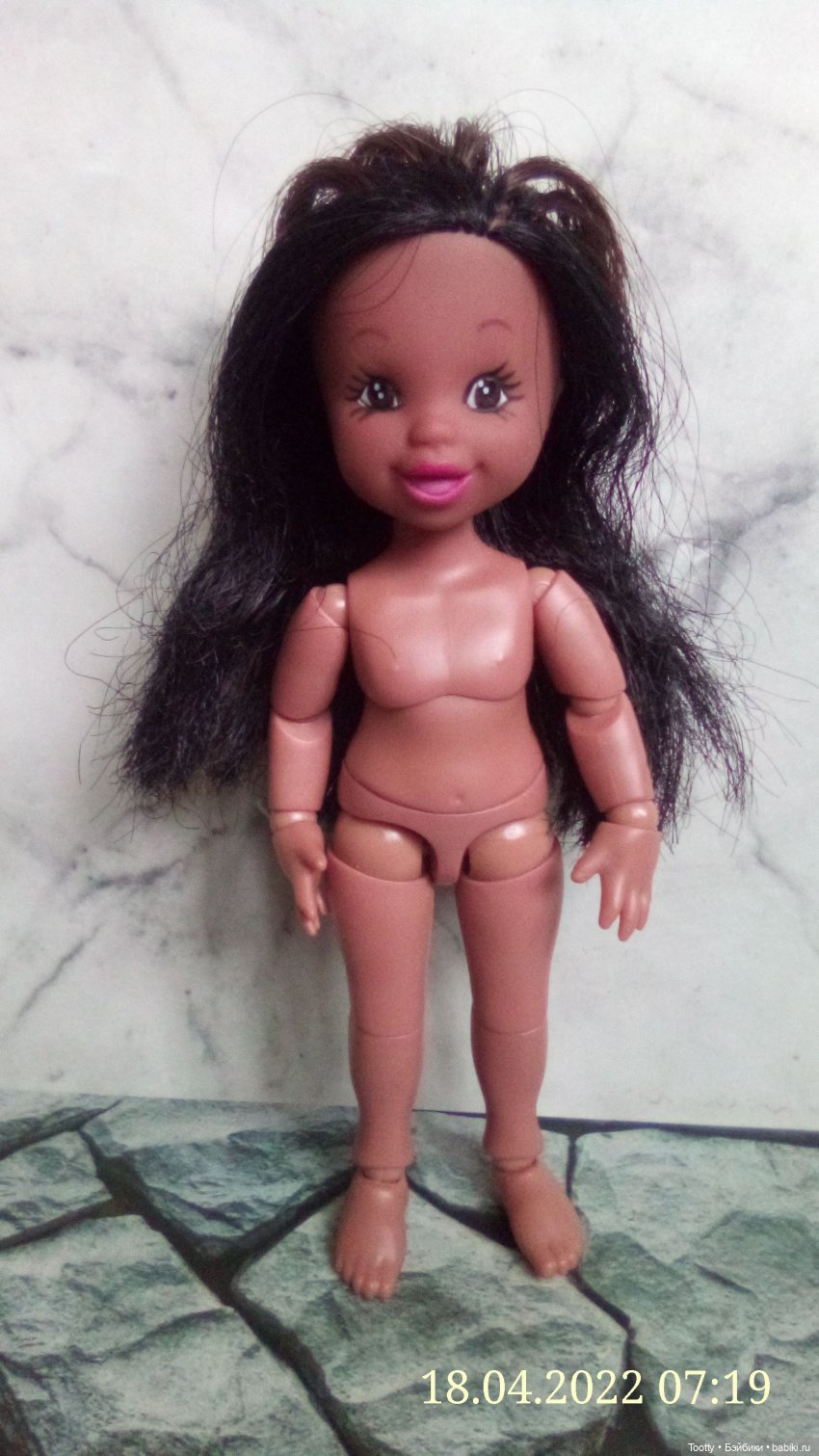 Пару недель назад ко мне приехала болванка, купленная исключительно из любопытства посмотреть вживую на шарниры и темный цвет тела. Вообще, я предпочитаю более традиционные ( условно) лица кукол, но поскольку меня покорили форма шарниров и подвижность ( если сравнивать со стандартными баболи), та я решила, что кукле быть. Ребенок приехал с подставкой и сменными кистями, но я пока боюсь их меня: родные никак не желают сниматься