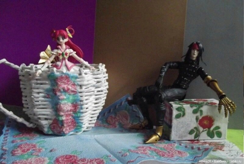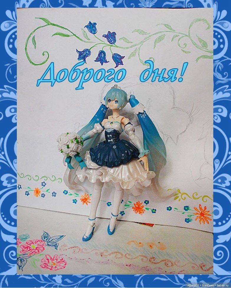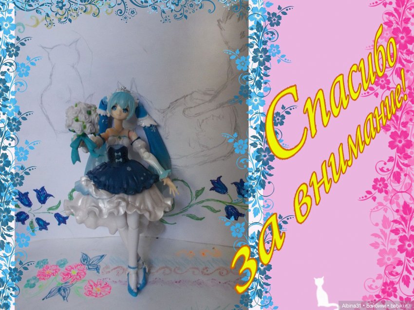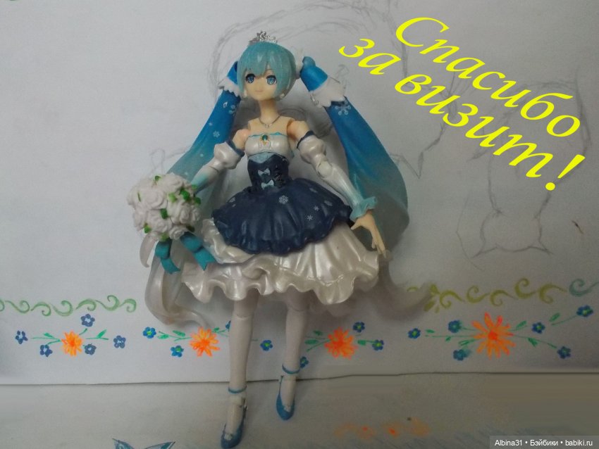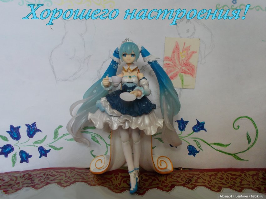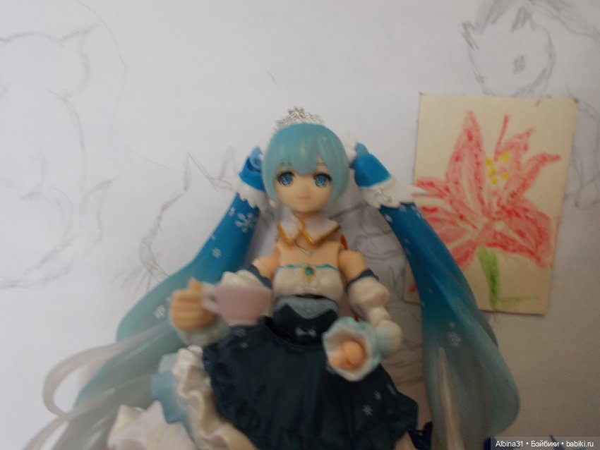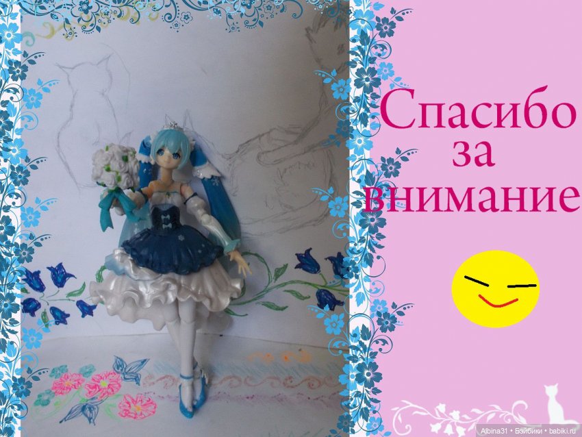 А мне нравится что она уже одетая и не надо парится одевать, раздевать… У неё есть вариант, это фото из инета, но я её (нижнюю юбку) не смогла поменять. кукла вся рассыпается на составные части, и боюсь применить усилия :) И так пришлось пять раз приклеивать тарелочку, а потом и кисть с тарелкой :), пока фотографировала, столько нервов потратила :))) В итоге с тарелки пироженко (кусочек торта) куда то улетел и дальше фотосессия была без него :))) В процессе да же не заметила, что Мику без кисти руки :))) Вот тогда и приклеила :) В коменте выше она без кисти, но по фото не понять :)