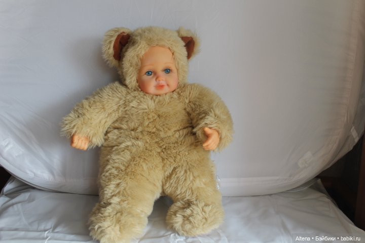 Здравствуйте, уважаемые любители кукол. Хотела показать вам ребенка-медведика, купленного в секонд-хенде и расписанного мной. Я тренируюсь в росписи кукольных лиц, и мне подумалось, что он вполне годный для этого — совершенно чистый винил, со стертой фабричной росписью. Опознавательных знаков я сразу не заметила — но мне показалось, что я уже где-то такое видела. Да и вообще — лицо милое, сама игрушка сшита аккуратно. А дома покрутила в руках — а у него обнаружилась поврежденная этикетка. Но разобрать можно: Анна Геддес. Я извинилась перед медведиком, что ему пришлось, бедняге, как безродному сироте, валяться в тележке со старыми кубиками и погремушками в магазине.И постаралась сделать ему такое лицо, чтоб он не обижался. И вот — он, мне кажется, вполне собой доволен, ушки приподнял и очень позитивно улыбается)