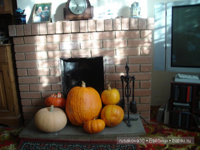 Красиво украшено место у камина, тыквы все разного сорта, красота! Очень оживляют украшения из тыкв интерьер и сад!