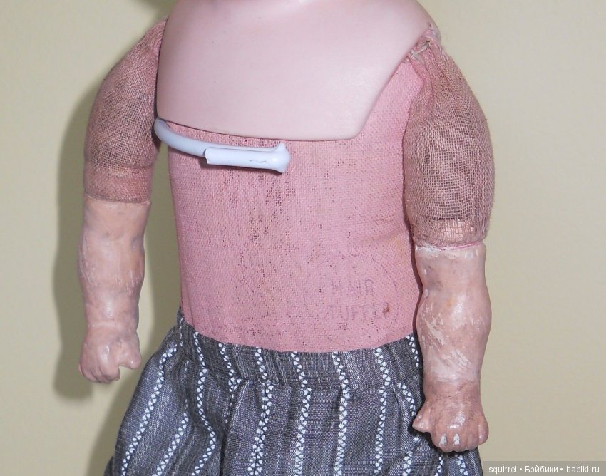 Меня, например привело в замешательство тело куклы Ревало, обтянутое розовой тканью с Пружинной натяжкой головы, а сама голова у куклы крепилась на картонном диске, который со временем осыпался.
