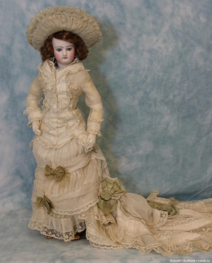 Про немок и француженок. Не знаю, как кратко написать. Например, у Жюмо было специфическое белье, у Штайнеров тоже некие характерные вещи. Если взять самую бюджетную куклу французскую, то она продавалась в рубашке. У жюмо специфическая рубашечка из редкого, как бредень хлопка определенного пошива с плетеным кружевом. Жюмовские платья простые с мелким рисунком. Немецкие вообще могли продаваться голыми или в белой рубашке. Если вы про дорогую одежду, то немецкие куклы могут быть одеты во французском стиле, но куклы не бюджетные. Просто тут опять же. Разница во времени.большинство кукол, которые у нас востребованы, немецкие, они выпущены позже 900 года и мода была уже другая, более лаконичная.