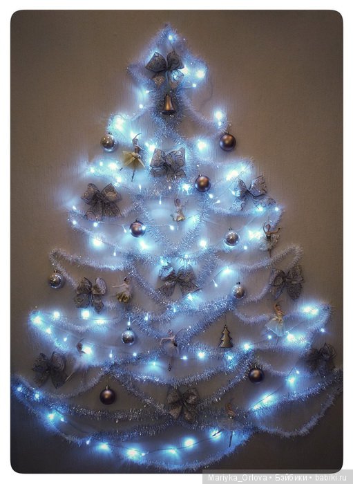 Мишура, гирлянда и игрушки на кнопках к стене прикреплены. И радует и место не занимает!