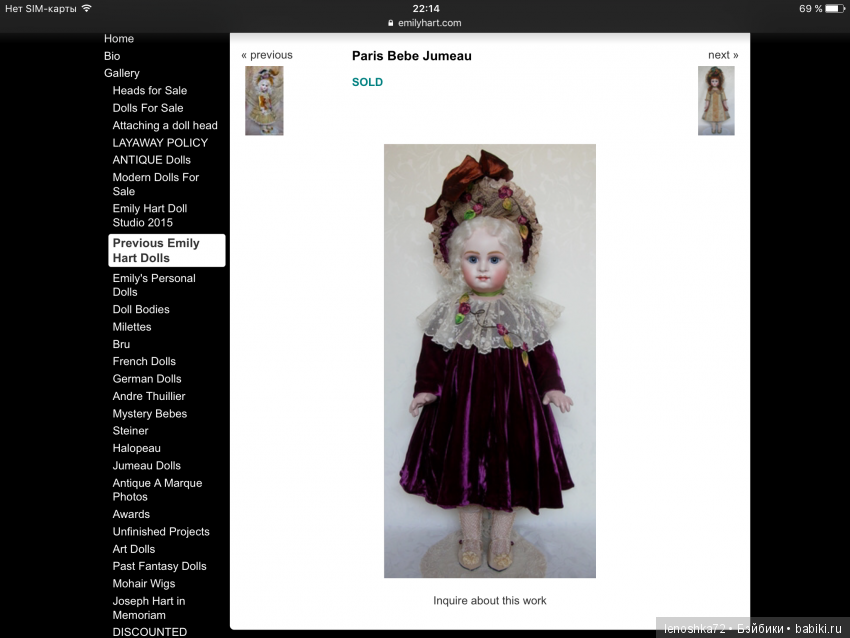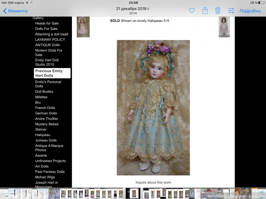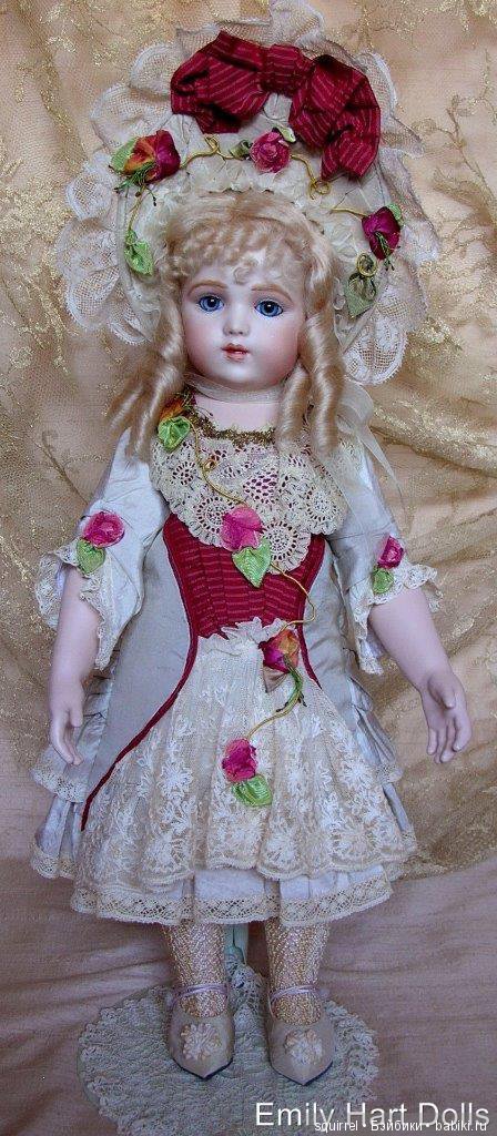 Добрый день дорогие форумчане! Представляю вашему вниманию реплику антикварной куклы от знаменитого мастера Emily Hart. Эмили Харт делает очень красивые реплики( для тех кто не знает), но об этом есть замечательный топик у нашей форумчанки allfordoll от 15 января 2016 года называется ,,Emily Hart и Ее куклы", не буду пересказывать, тем более топик написан интересно, кто заинтересуется может почитать, очень познавательно. И вот я никогда не думала, что можно так желать куклу. Тем более антикварными и репликами никогда я не интересовалась. Антикварок я вообще боюсь, какую они там энергетику с собой принесут.А тут увидела продаётся кукла, необычайной красоты, как посмотрела, так и пропала! Да и цена, космос! Ни сна, ни отдыха вертится в голове, и все тут! Искала очень долго и вот наконец нашла, со всякими перепитиями купила Ее, и вот приехала моя малышка ко мне! Она оказалась ещё лучше, чем на фото. Сказать красота, это сказать ничего! Нежнейшее и милейшее создание. А наряд Ее, это отдельная песня такой красоты я ещё не видела, корсет как настоящий, все продумано до мелочей, от туфель до шляпки бонета. А позитив от неё необыкновенный.Хотя у меня много кукол, но эта, ни с чем не сравнима! Хочу с вами поделиться своё радостью, может кто то тоже захочет стать обладателем подобного чуда и будет таким же поклонником Эмили Харт как я. Всем хорошего просмотра!