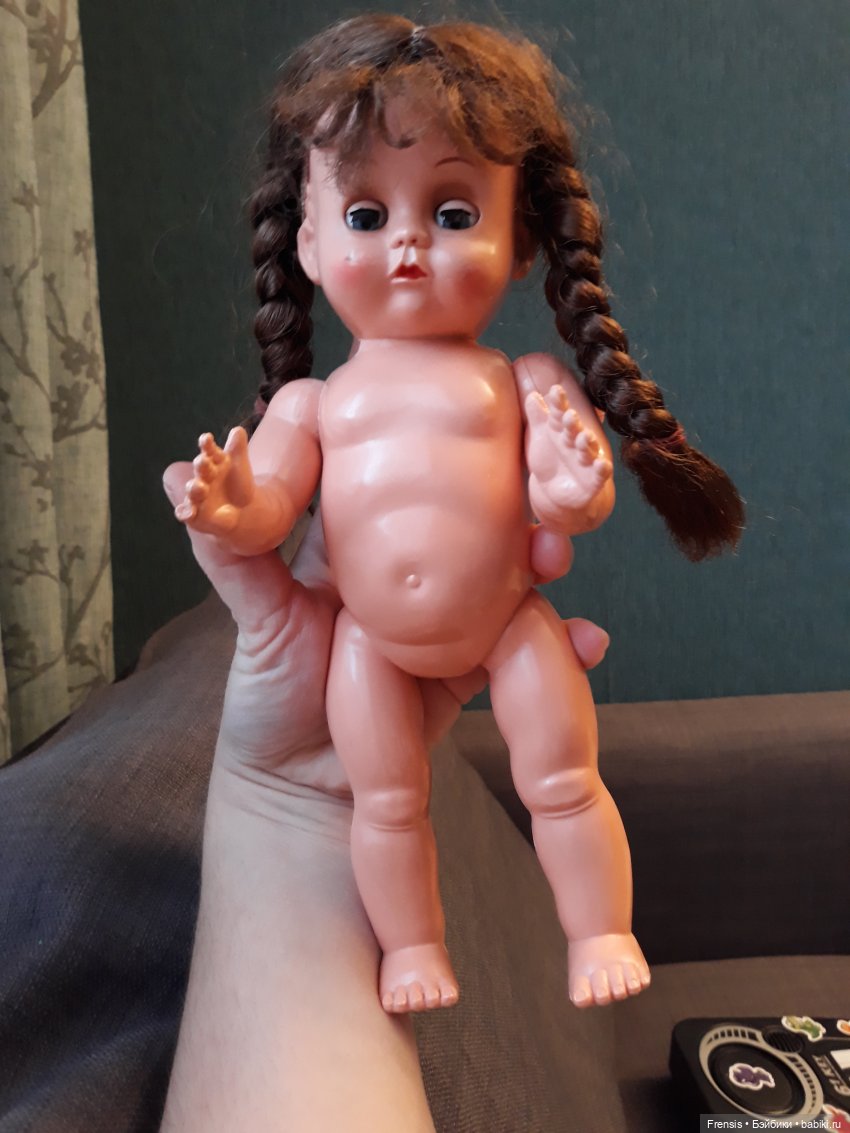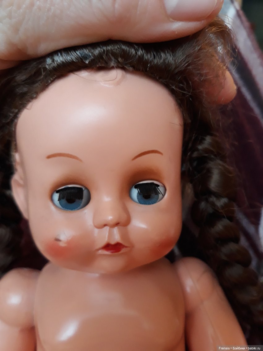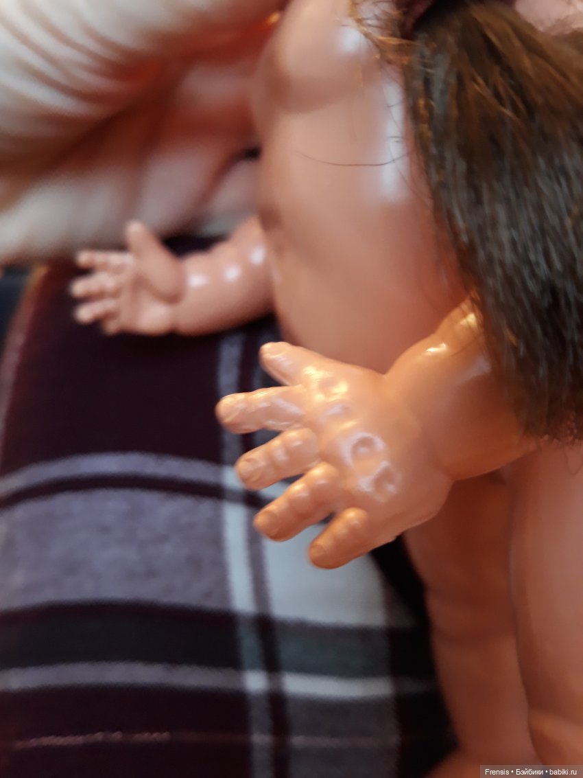 Девочка мелкая, из твердого пластика, кажется, в паричке, но с молдированной прической под ним. Глазки спящие пластиковые. Маркировок никаких. Пузико, коленочки и щечки — сладкие и пухлые! И крупные ладошки с колбасными пальчиками)).