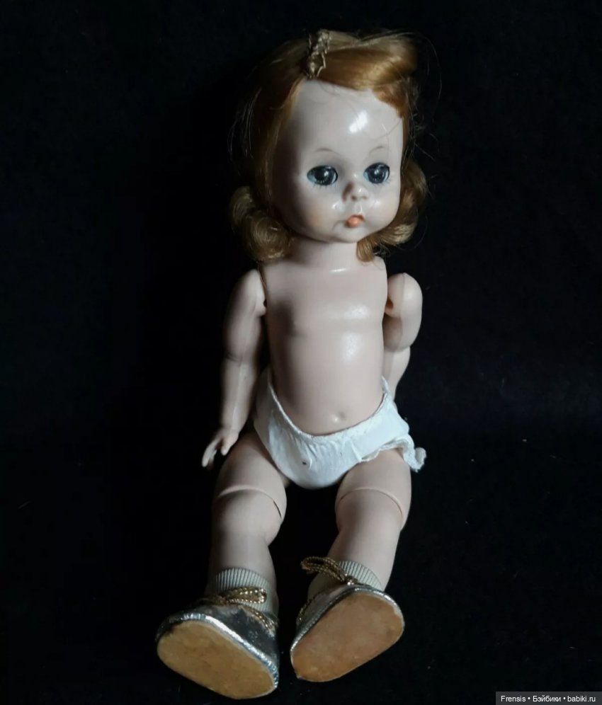 Постараюсь показать наглядно все основные виды Мадам Александр. Начну с уже редких Alex kins, 7.5 инчей, примерно ранние 50-е годы пластик, спящие глаза, у части кукол — сгибающиеся коленки. Одежда имеет лейбл Мадам Александр, обращайте внимание, чтобы были туфли и шляпки, иногда продавцы «забывают» положить оные аксессуары.