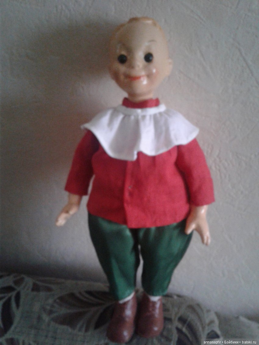 Кукла была довольно в плачевном состоянии — паричок спутался, хотя были обе косички и даже ленточки в них. Ростом — как маленький ребёнок. Кукла несколько раз падала — был сколотый слой на носу, щеках, кое-где на лбу — дорогие товарищи! — я помню её как сейчас! Глазки, кажется, были закрывающиеся, но закрывались вразнобой, на одном не было ресниц. Тело было полностью из прессопилок — и руки-ноги и туловище. Пальцы на руках были не то частично отбиты, не то сильно повреждены. Ноги были обе, но на одной ноге было отбито половина стопы и приклеена. На кукле были трусики, вышитая красивая длинная рубаха с такими скрученными нитяными завязочками и два таких клетчатых фартушка — спереди и сзади, которые как бы формировали юбку. Когда-то на ней были ещё полосатые носочки и чувяки из настоящей кожи. И носочки и обувь давно потерялись. Натяг резинок давно ослаб и руки-ноги голова у куклы болтались, отчего она, когда её брали на руки, сильно напоминала тяжелобольного ребёнка.