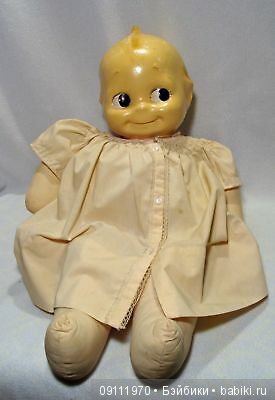 Хоть я не знаток старых кукол, подозреваю, что эта большая старинная Кьюпи. Посмотрела в поисковике нашла по фото две похожие. По времени приблизительно 1920-1940 года… Но ещё какой-то информации найти не удалось…
