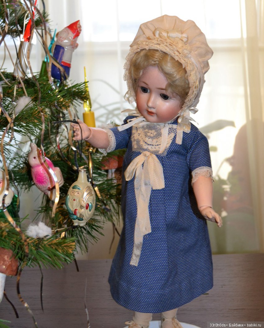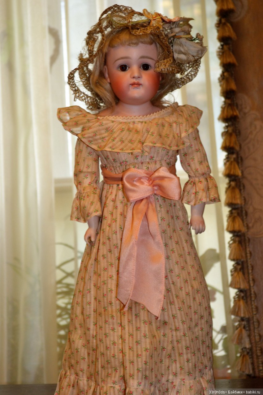 После возвращения в Англию, Джуди отыскала в книжке маркировку и определила ее принадлежность по слабо видной подковке на спину к куклам Эрнста Хойбаха. И хотя это была немецкая кукла, а не француженка, но ее бледный фарфор и необычные для антикварок серые глаза привлекали внимание и оставляли сильное впечатление на всех, кто видел эту куклу. Джуди сшила ей канареечно-желтый наряд из антикварных тканей. Вот такой она стала.