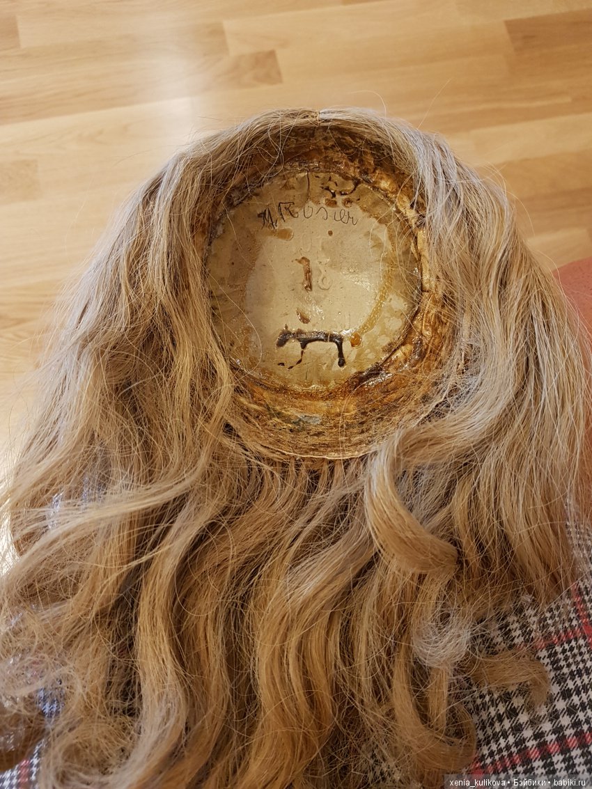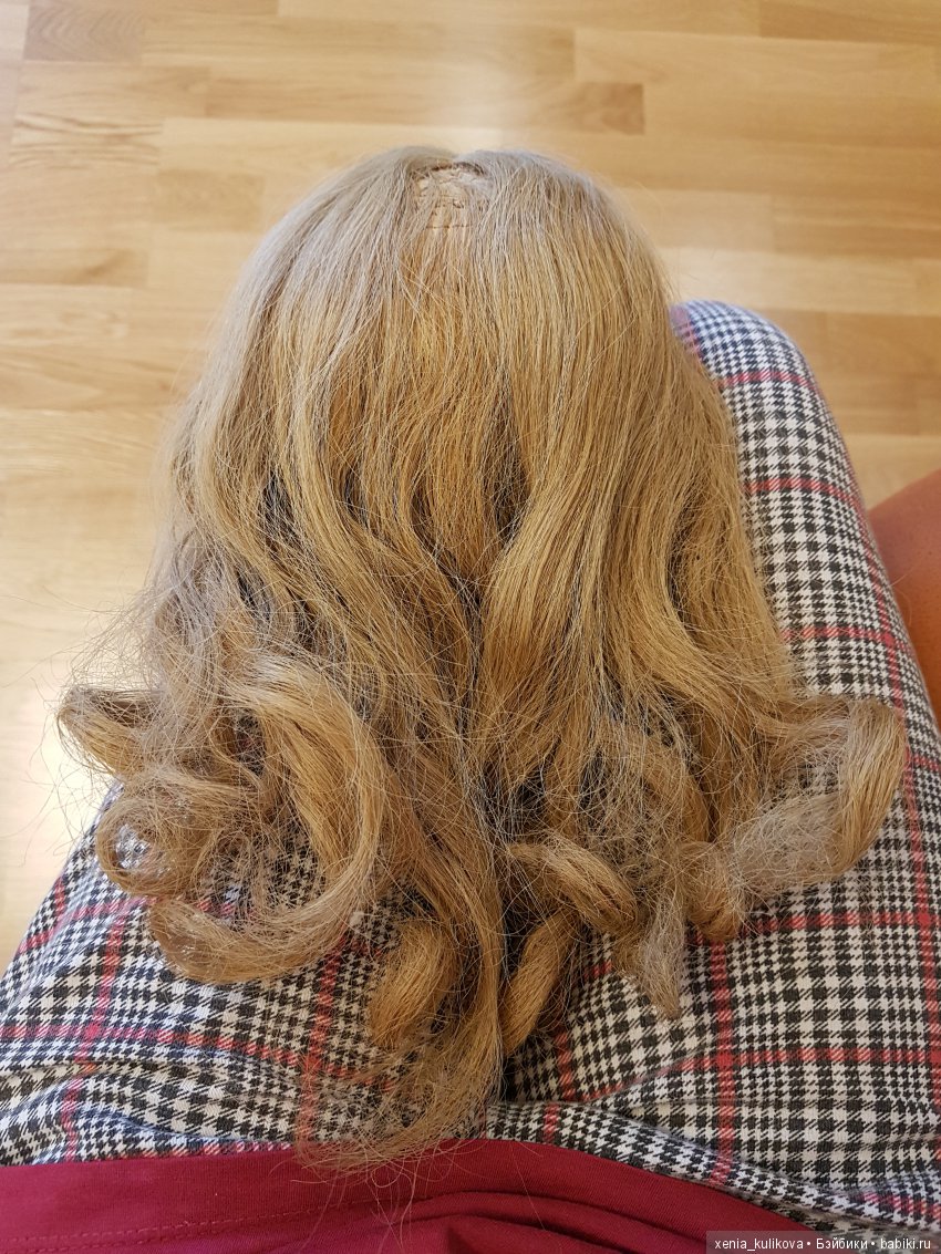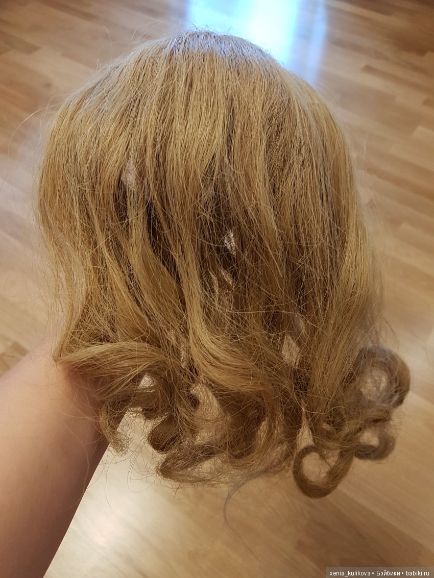 Я всё детство расчёсывала шикарные волосы ГДРочек, плюс у меня есть Барби девяностых — струящиеся, сияющие жидким золотом шёлковые локоны, которые вообще никак не поменяли свой вид. Исходя из этого скажу чисто моё впечатление — парик ужасен. Пресловутый пробковый пейт изнутри в жутких коричневых потёках, будто плавал в луже, а волосы жёсткие, сухие, тусклые и висят сосульками. Напоминает волосы старой ведьмы. Воля ваша, но парик ребёнку буду заказывать новый и красивый — никакой антикварной ценности в этой жуткой мочале я не вижу, хоть убей.