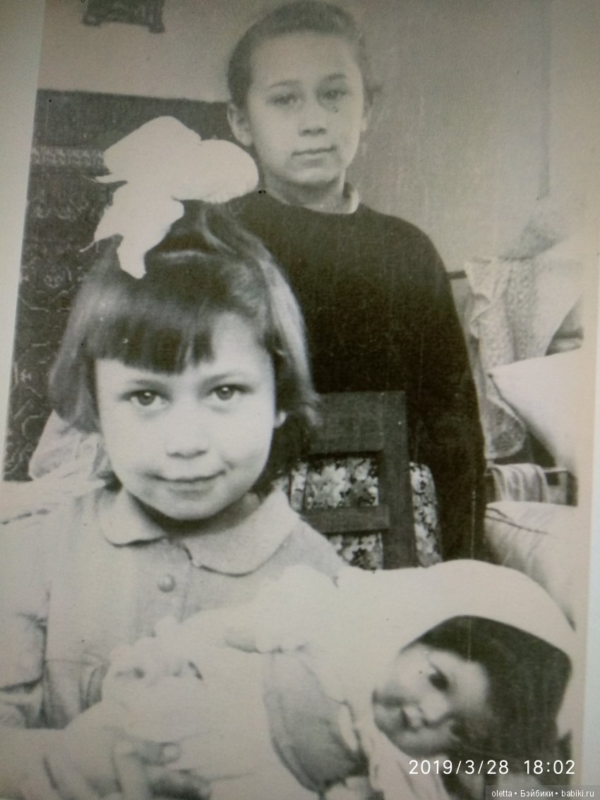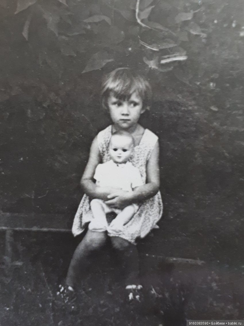 В тот день, когда купила куклу, похожую на мою, вечером даже всплакнула. Как быстро все проходит. Хотя, по правде сказать, я не сильно любила свою куклу, мне казалось, что она тяжелая (наверное, была, для ребенка 5-6 лет), но я с ней много играла. Жили мы в коммуналке, как только 5 человек помещались в 1 комнате. Сидела я с ней на мешке с лоскутками в закутке между шкафом и окном, на подоконнике стоял радиоприемник, который я очень любила слушать. С тех пор люблю Георга Отса, его часто передавали. И тряпочки люблю, и шить. Помню даже, как меня фотографировали с этой куклой, только вот почему я такая растрепанная, не знаю. Проще наверное, ко всему относились? Куклу мне подарила богатая бабушка, мать моего отца (интересно, сколько она стоила в магазине в те времена, может, кто знает?). Она делала редкие, но значимые подарки, например, швейная машина-тумба «Чайка», стоила аж 215 рублей! Позже у куклы, видимо, отвалились глаза, и я ее стала просто бояться, этих пустых глазниц. Куда она делась после — не знаю, выбросили, наверное, с переездом в новую квартиру. Долго я вообще о ней не вспоминала. Сейчас, когда появился интерес к куклам, просто захотелось определить — кто же она? Кукол то у меня было мало, всего 3 — советский пупс большой в раннем детстве, эта и потом еще немка, но это уже отдельная история. Начала искать, сначала прочесала советских кукол 60 годов, потом наткнулась на то, что искала. Атрибутировала я ее как Sonneberger Porzellanfabrik SP 60. (если ошибаюсь, поправьте меня). Парик у куклы приклеен очень крепко, не хочу его отклеивать, поэтому клейма не видно. Кукла в очень хорошей сохранности, по-моему, и одежда родная. Ну вот я и нашла то, что искала, пусть не очень красавица, и прическа другая, но личико знакомое. Кусочек детства.