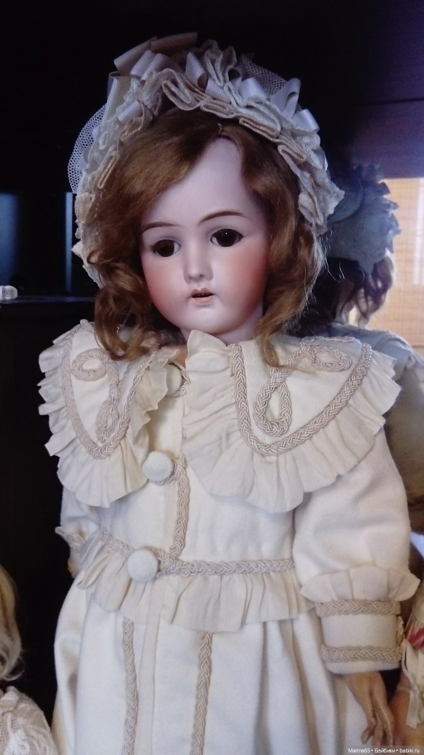 Аннушка, William Goebel, В-3, рост 62 см. Она одета в бархатное платье, рукава которого из шёлка. Ткани использованы винтажные. Платье дополняет антикварный накладной воротничок и антикварные бусы из панциря черепахи. Анна привезла с собой два паричка, которые ей очень идут. Но накануне мы с Анной примерили ей ещё один парик, который пока что и остался на ней. Этот парик ей тоже очень идёт). Ну и великолепный боннет — буквально «вишенка на торте»). Спасибо за созданный образ Аннушки её прежней владелице или как ещё говорят — хранительнице.