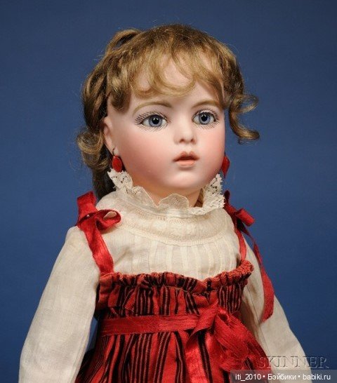 17" (43 см.) Бисквитная поворотная головка на ребристой наплечной пластине бисквита с моделированной грудью и лопатками, синие стеклянные спирально-резьбовые вставные глаза, темная подводка для глаз, накрашенные ресницы, брови с мазками и перьями, акцентированные ноздри, закрытый рот с изящно очерченными губами, проколотые уши, светлый мохеровый парик, французское тело малыша Бебе с ластовицей на коленях и бедрах, бисквитные предплечья. Состояние: в целом отличное, некоторые легкие заплатки детского тела.