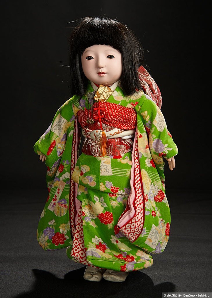 Японские куклы Ичимацу. Гофун в необычном зелёном кимоно из крепового шёлка. Начало- середина 1900х. 38см. US$2300