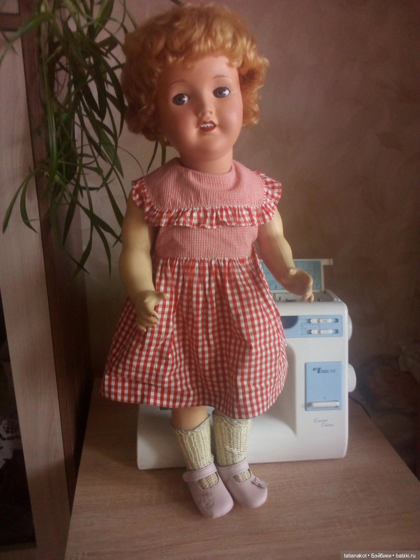 Как же я мечтала о куколке такого плана. Прошло много времени и вот она нашла меня или я её). Однажды отдавали игрушки бесплатно, я за ними поехала и увидела её! Поинтересовалась у девушки не собирается ли она продавать куколку ( она пока не планировала((( ). И вот сегодня я увидела её в продаже, и просила её (куклу): «Только дождись меня!» И вот мы дома, я в восторге! Прошу всех помощи: скинуть ссылки как привести её в порядок: (парик, можно ли её тело протереть и чем, и может кто подскажет какого года приблизительно кукла). Всем заранее спасибо.