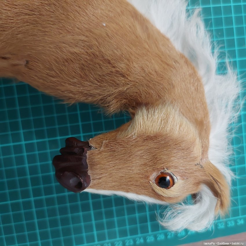 . Приложив шкурку, примерно отметила (на глаз) где нужно покрасить ее, т.к. белая собака мне показалась не интересной. шкурки красятся легко краской для волос, с тем же эффектом, как мы красим локоны для кукольных волос. Цвет получается более темным и серым. Перед окраской мездру смазываем кремом, красим, выдерживаем, смываем. Шкурку промокаю полотенцем, сушу, и периодически разминаю. Результат порадовал. Мездру больше кремом не мажу, что бы клей прилипал лучше… Можно оклеить собачку и ворсистыми тканями-экомехом, например.Клеить лучше всего клеем Титан. Он недорогой, намазывать надо только одну сторону, в отличие от клея Момент, где смазываются обе стороны.Возможно, старинные собачки были оклеены при помощи столярного или костного клея и вполне себе дожили до наших дней.