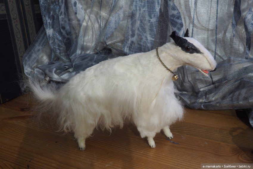 Это моя борзая. Ракурс, правда, получился неудачный: в жизни он не садится на задние ноги. Сделан также по каркасу из папье-маше. Сверху стриженный овечий мех.