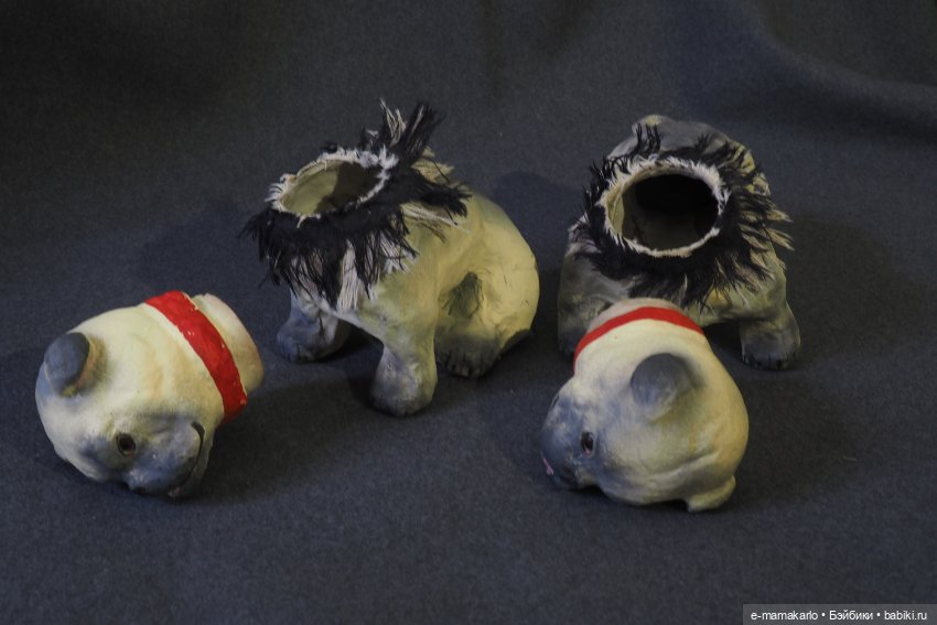 На этих фото два собакоконтейнера, реплики антикварных контейнеров для конфет. Для голов сняла силиконовый молд с фарфоровой немецкой карандашницы периода Первой Мировой войны, тушку лепила из пластилина, потом обклеивала кусочками бумаги. Сверху акриловая краска. Глаза вставные, антикварные, для кукол.