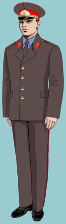 б) армейского образца, со стоячим воротником на пяти пуговицах, с карманами с клапанами на пуговицах.