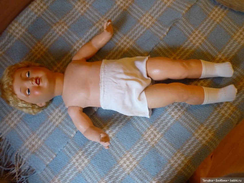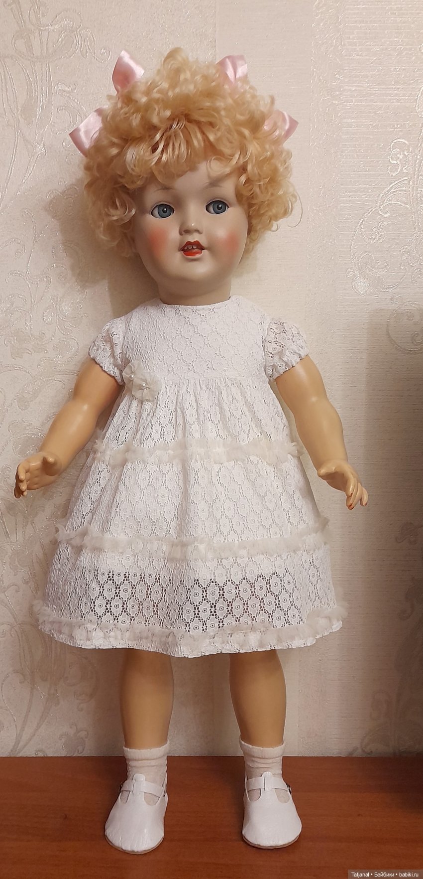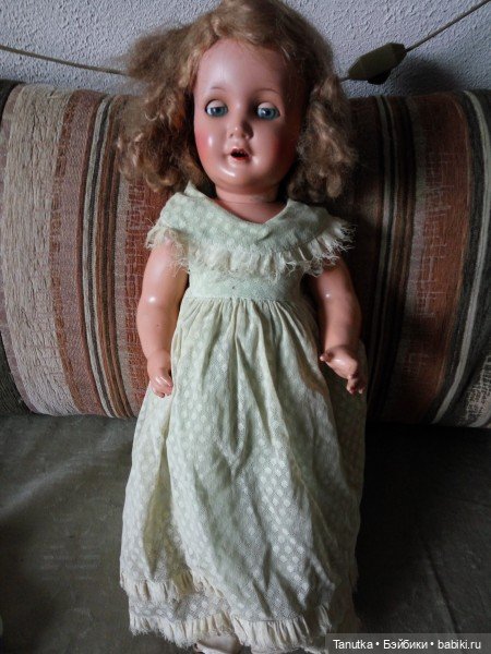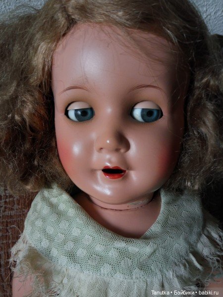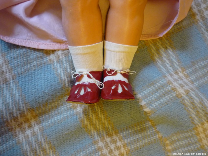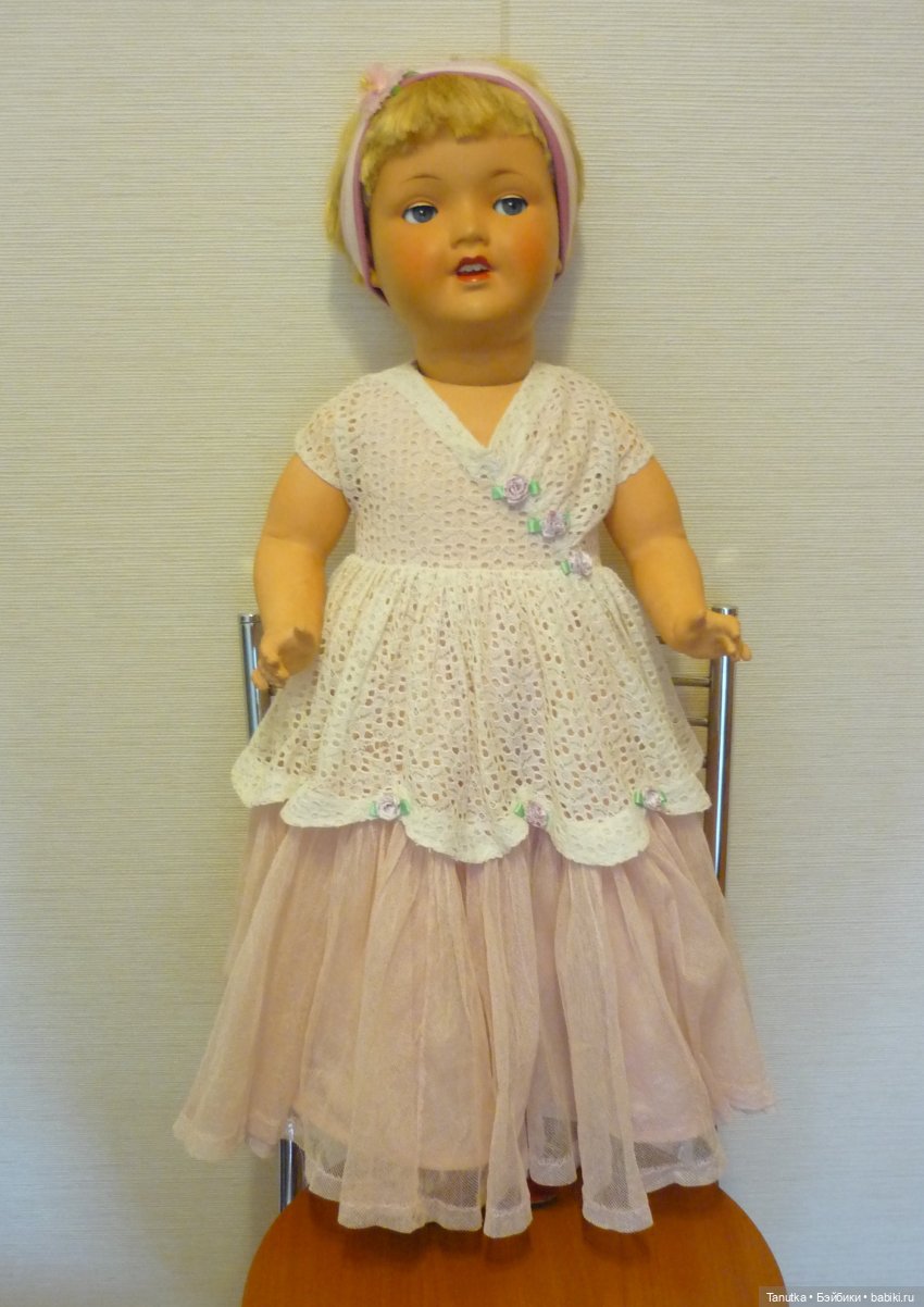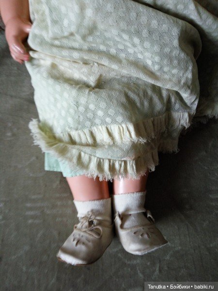 У меня такая кукла послевоенная, мне ее подарила женщина, которой папа привез эту куклу после войны. У нее голова-композит, тело-папье маше, а руки-ноги тортулон. Извиняюсь за туфли, моя