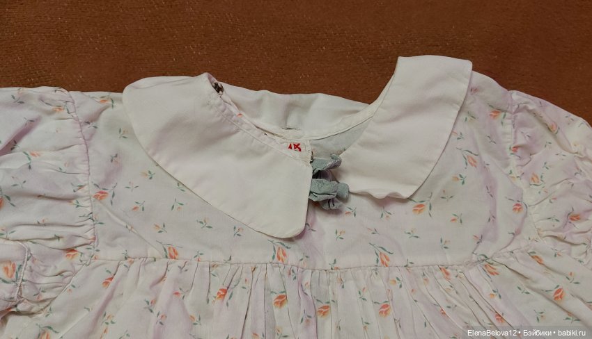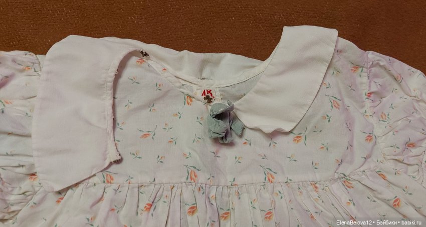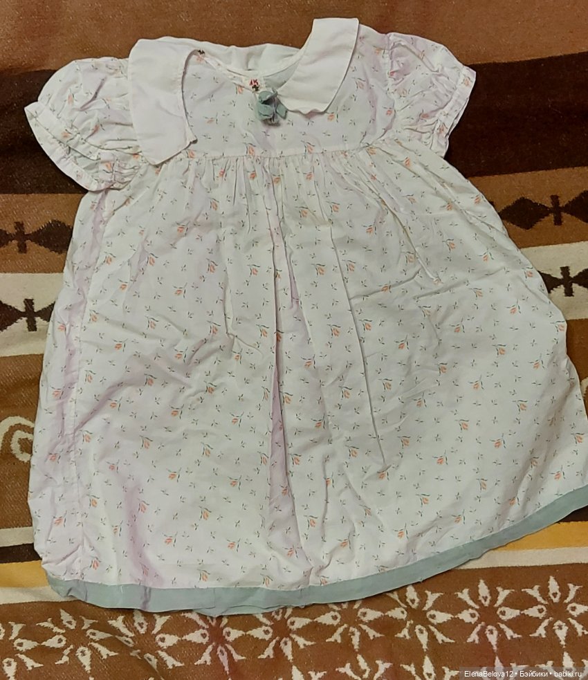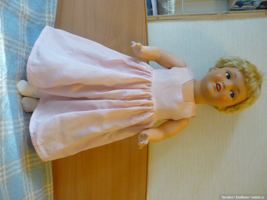 Как думаете, какого года кукла? Платье сеточка, рубашка под ним похожа на шелк, но искусственный, шуршит. Хотя без поджигания нитки не могу точно сказать, а тянуть нитку не хочется. Платье чинить не придется, постирать и отпарить — все. На спинке застежка на крючках.