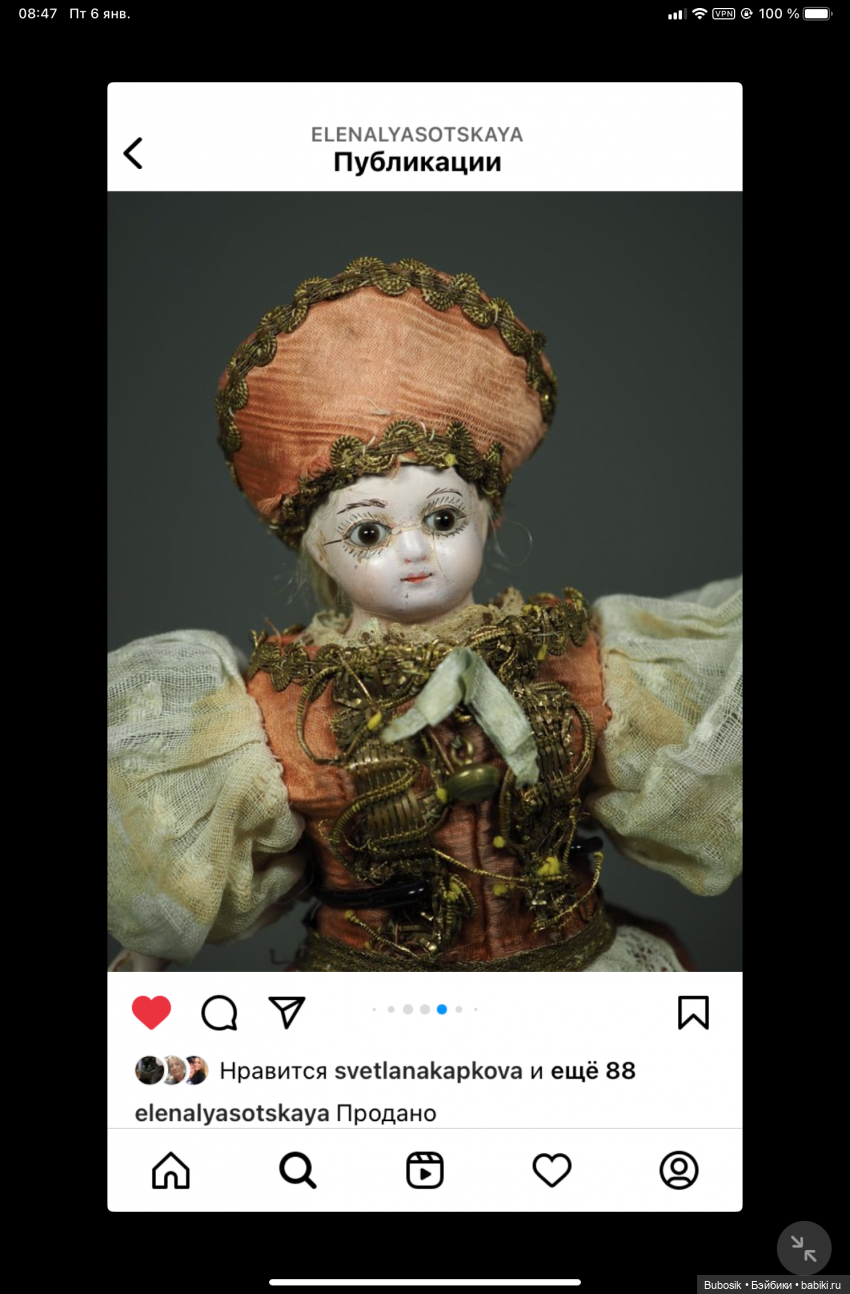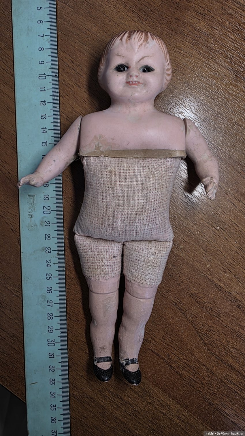 Здравствуйте, уважаемые знатоки старинных кукол! Не пишу антикварных, потому что не могу сказать, точно ли это антик. Прошу вашей помощи в определении происхождения куклы, поселившейся у меня. Как со мной иногда бывает, стоит заинтересоваться какой-то куклой — вдруг откуда ни возьмись подобные куклы начинают попадаться едва ли не на каждом шагу. Пока одна из них, как мне кажется, самовольно не вторгнется в мой дом. Такая вот история случилась и с этой куклой. Увидела я ее на Мешке, чем-то привлекла внимание, хотя с такой ценой куклы обычно проходят мимо меня.