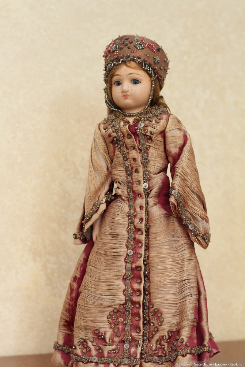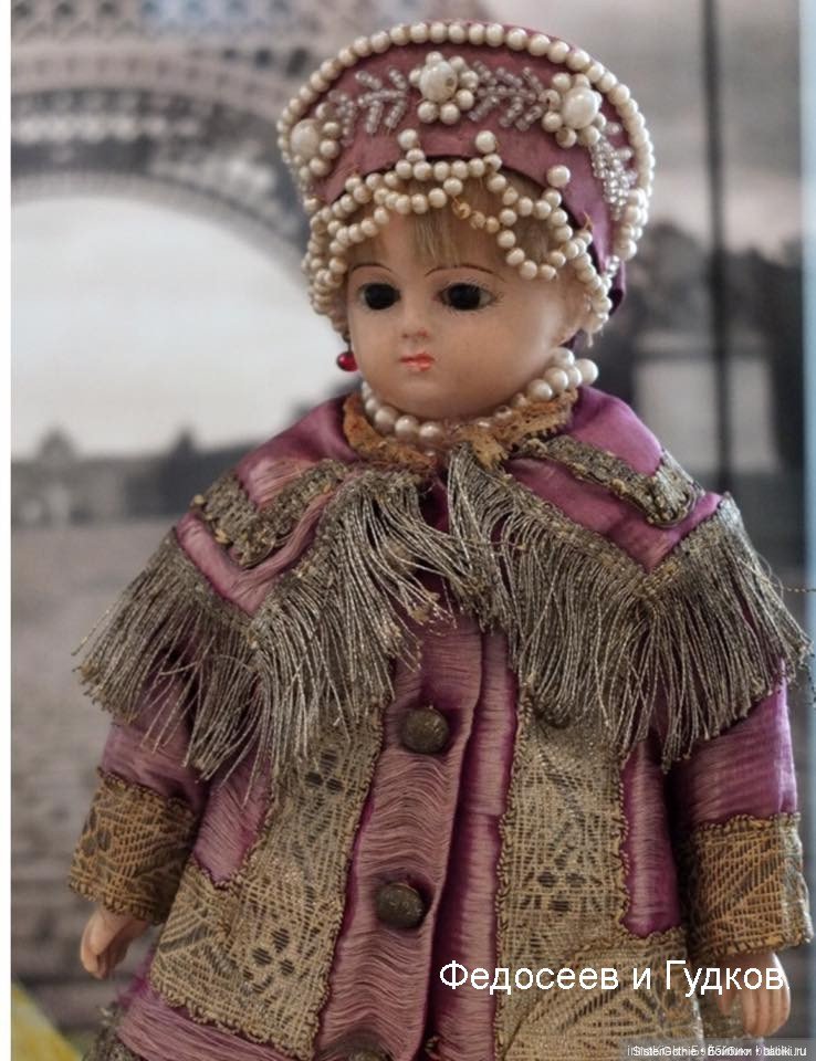 В описании продавец пишет, что эта кукла произведена в артели Федосеева и Гудкова примерно в 10-х годах прошлого века. Про такую артель я и не знала. стала искать информацию, ее оказалось крайне мало. Во всех источниках повторялось одно и то же: артель работала с так называемой русской мастикой, из которой делались головки кукол, они имели характерную роспись, якобы несущую в себе признаки иконописной школы… Обращали внимание на необычные глаза, особенную роспись бровей, тщательно проработанные детали костюма. Нашлись атрибутированные куклы.