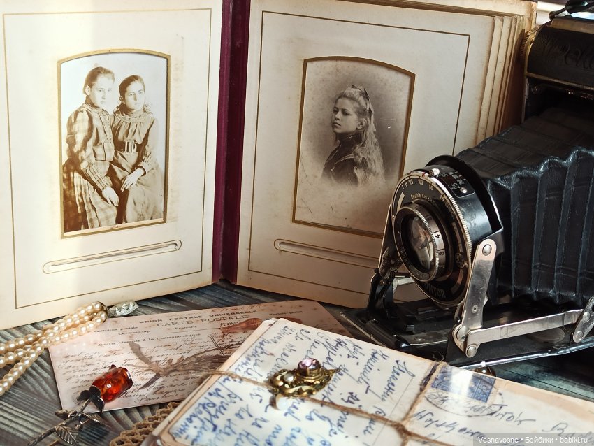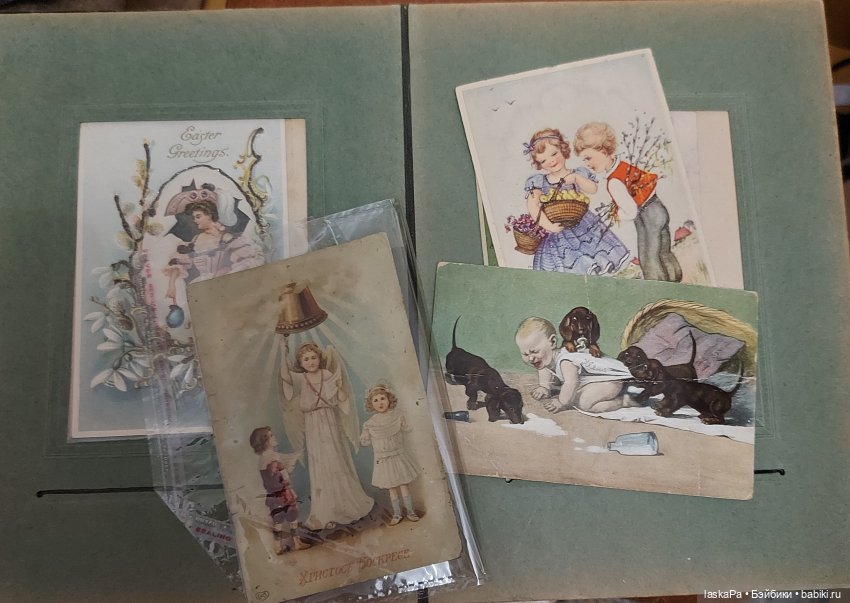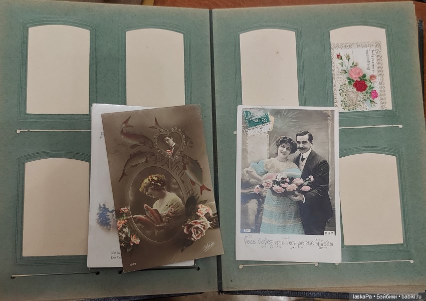 У меня есть один разваливающийся альбом, в нем открытки, да и то в основном просто между страницами. Окошки под фото очень нестандартный для нас формы, да и вообще в основном дошедшие до нас фото оформлены в паспорту, их точно в альбом не вставить.
