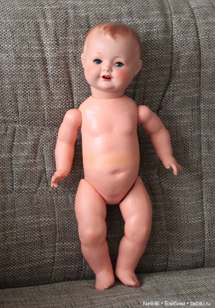 Пупс явно побывал на пожаре, кисти рук деформированы, на теле трещины, на лице сажа, зато до сих пор попискивает при наклоне. Судя по клейму на шее — Sonneberg, то есть уж никак не Пуммель. Я ещё раз переспрашиваю у мамы, мама стоит на своём.