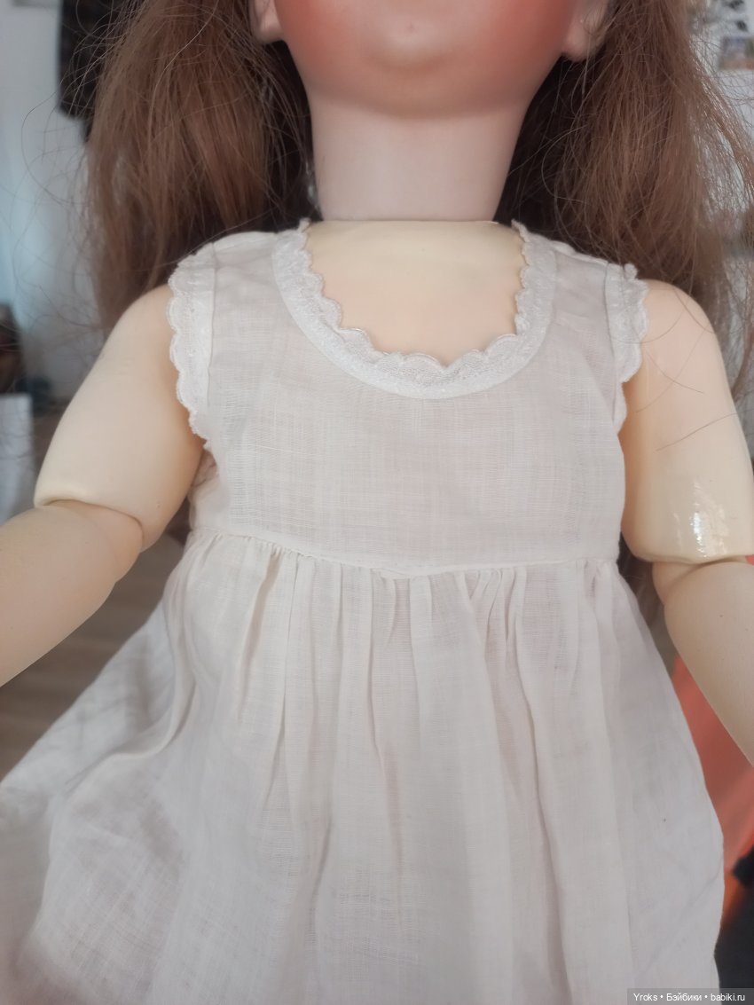Волосы натуральные, головка фарфор, тело шарнирное, пальчики отломаны, видно что не опилочное. Платье очень красивое, натуральный шелк. Я знаю, что на сайте очень много разбирающихся людей, подскажите пожалуйста что за реплика у меня теперь живет. На затылке есть клеймо, но оно непонятное