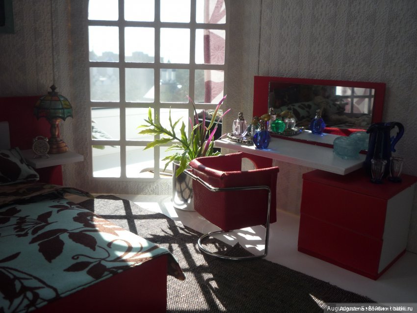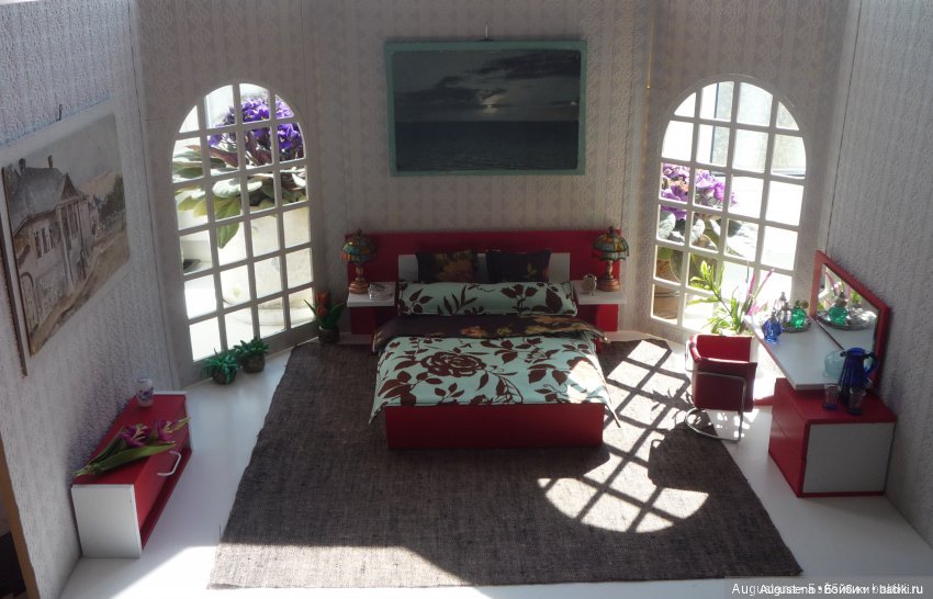 А эту комнату я делала сама. Мои главные персонажи 1/12 живут в современности. С мебелью для них тоже намучилась. Года 4 назад, когда искала, современной ещё было не много, всё большем викторианская, вот и пришлось делать самой.))